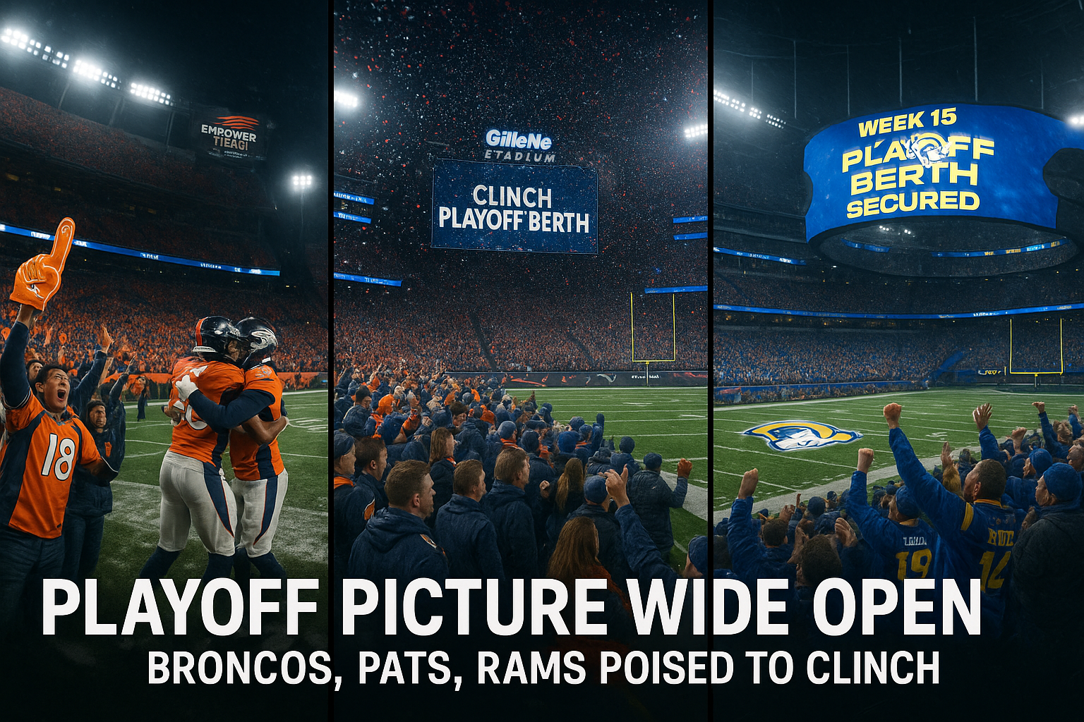 Fans of the Broncos, Patriots, and Rams celebrating potential Week 15 NFL playoff clinches in packed stadiums.