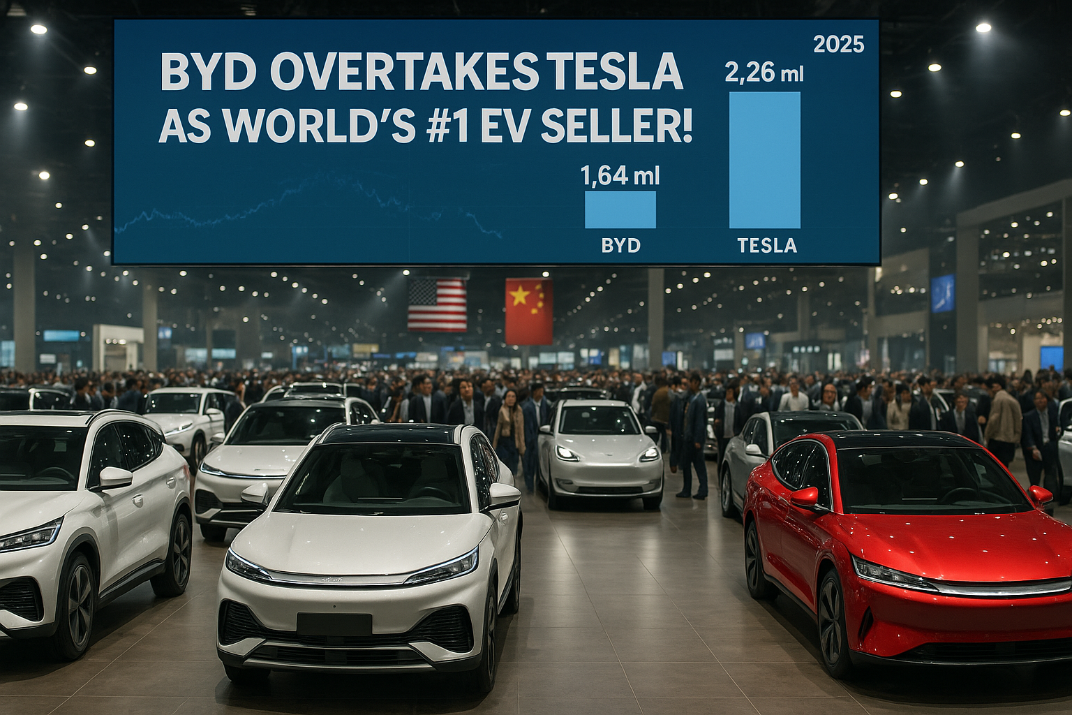 BYD surpasses Tesla as top EV seller in 2025, illustrated with sales charts and vehicle lineup in a showroom.