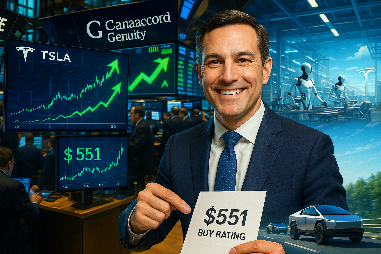 Illustration depicting Canaccord Genuity analyst raising Tesla stock price target to $551 with bullish charts, futuristic autonomy visuals.