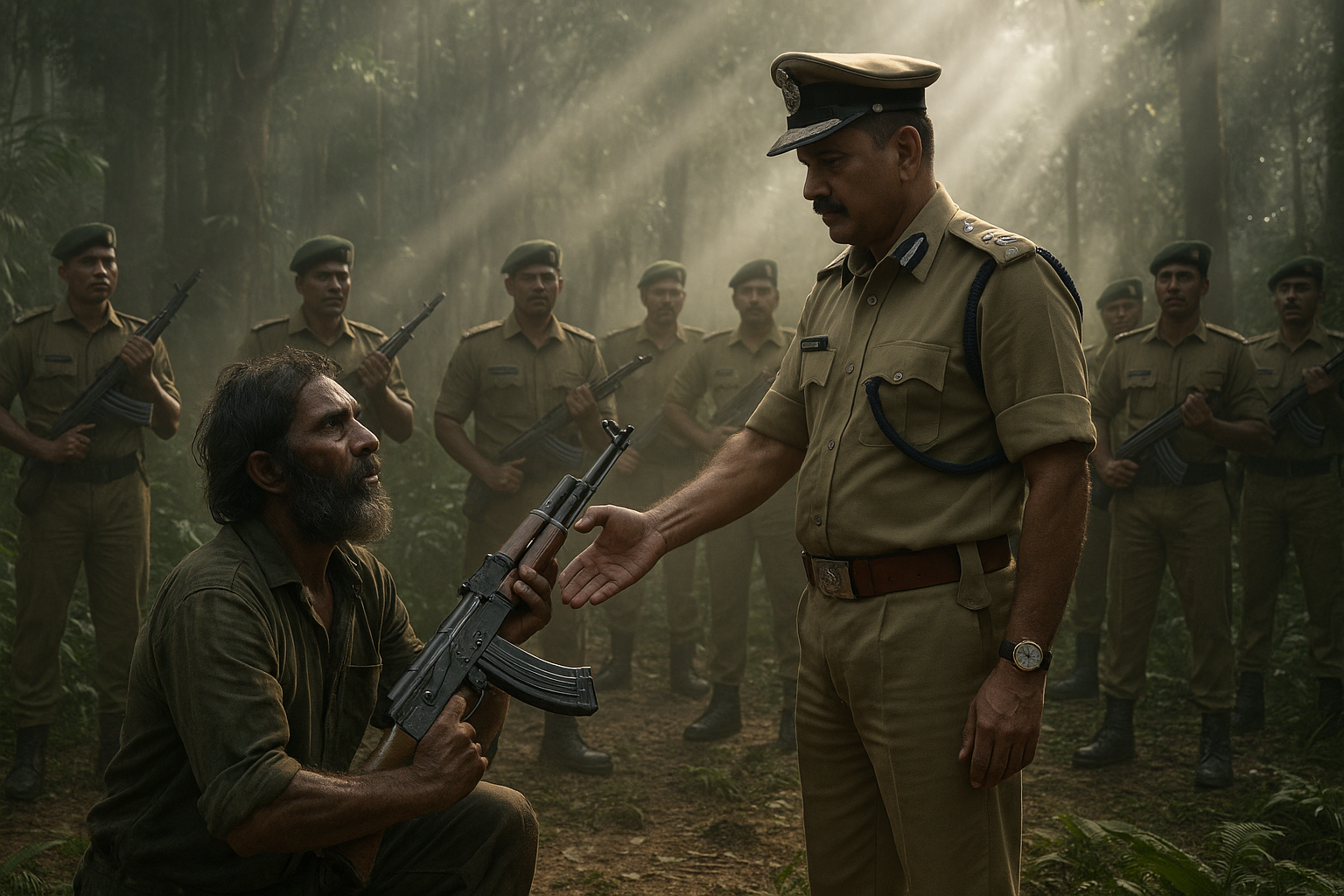 Maoist commander Barsa Deva surrenders weapon to Chhattisgarh police in Telangana forest, illustrating victory over Naxalism.