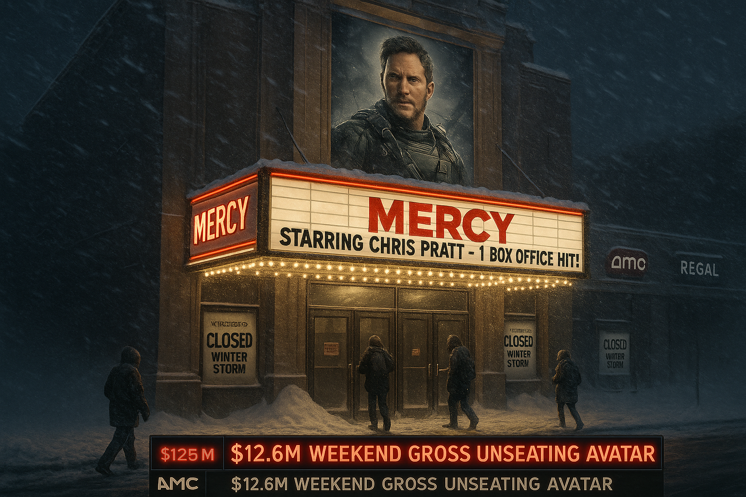 Amazon MGM Studios' dystopian thriller 'Mercy,' starring Chris Pratt, is projected to top the domestic box office with $12.6 million over the weekend, unseating 'Avatar: Fire and Ash' after five weeks at number one. A massive winter storm from Texas to New England has forced numerous theater closures, contributing to the lowest-grossing weekend of 2026 so far at $58.4 million. The storm's impact includes shutdowns at major chains like AMC, Cinemark, and Regal.