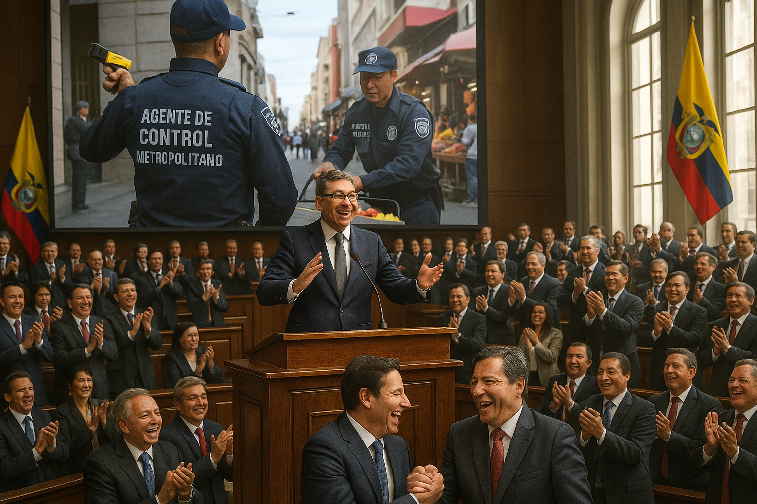 Lawmakers in Ecuador's Chamber of Deputies applaud the approval of the Municipal Security Law empowering inspectors with tasers, screen shows key powers.