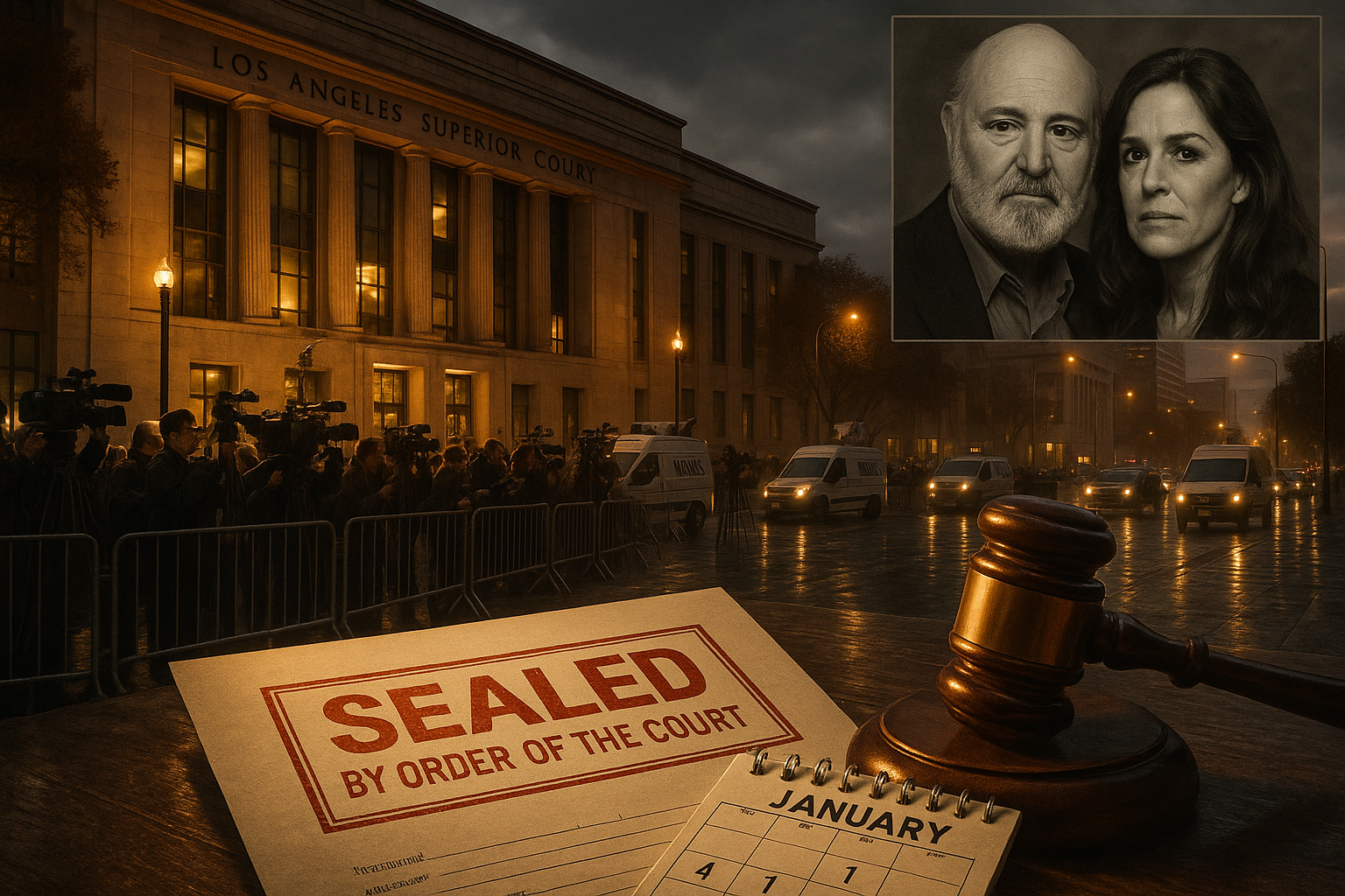 Dramatic illustration of LA courthouse sealing records in the Rob Reiner stabbing murder case, with journalists and sealed documents outside.