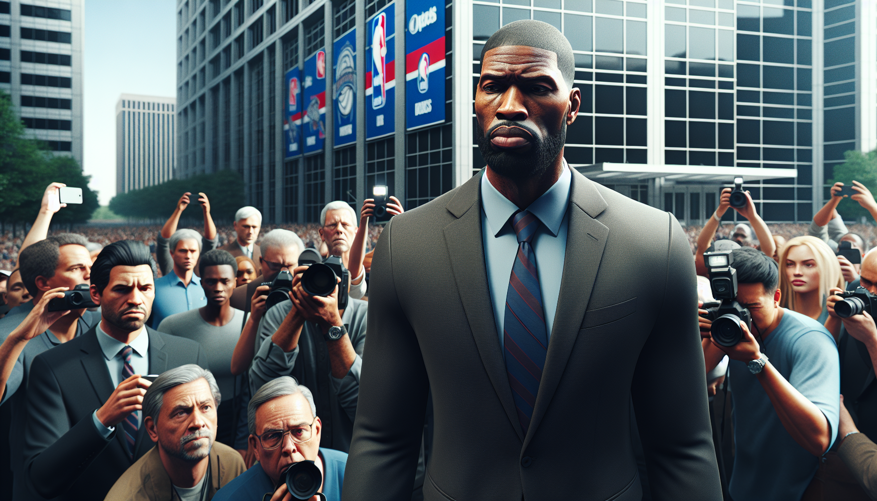 Photo of Nico Harrison exiting Mavericks headquarters after being fired, surrounded by media.