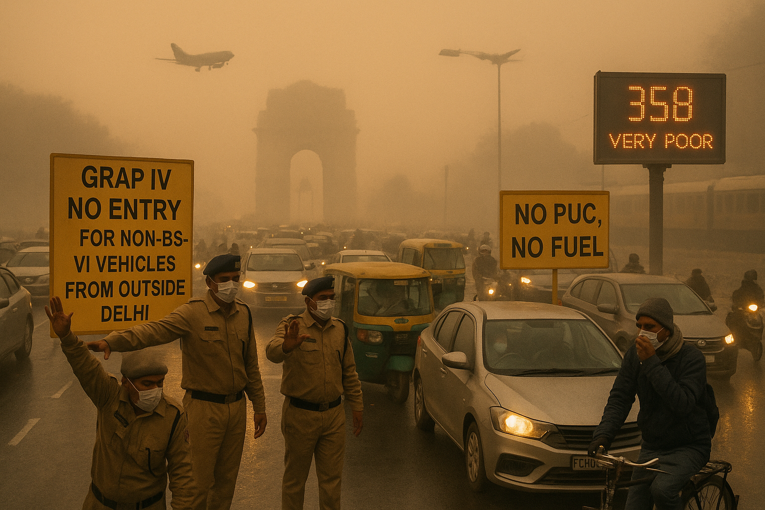 Delhi enforces GRAP IV vehicle curbs amid AQI 358 and dense fog disrupting traffic, flights, and trains.