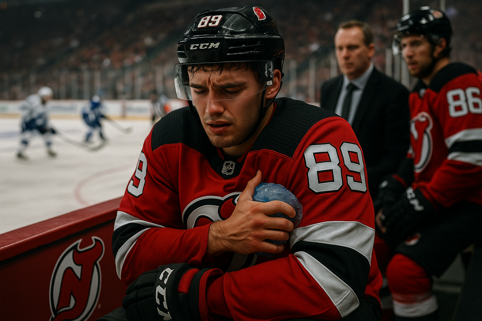 New Jersey Devils forward Arseny Gritsyuk sidelined on bench, holding injured shoulder during NHL game.