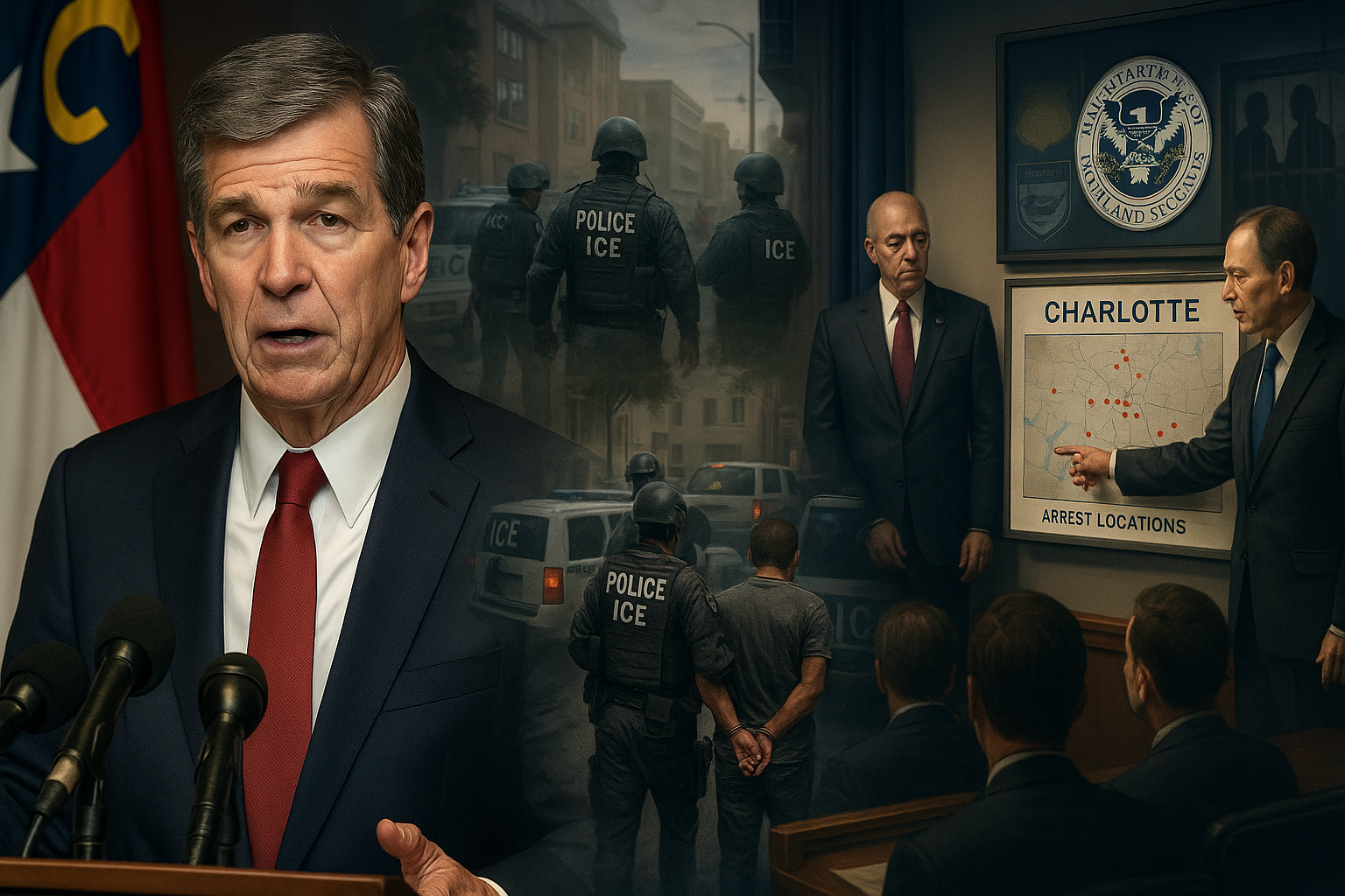 Illustration depicting the conflict between DHS and Roy Cooper over Charlotte immigration enforcement, showing split scenes of press conferences and operation activities.