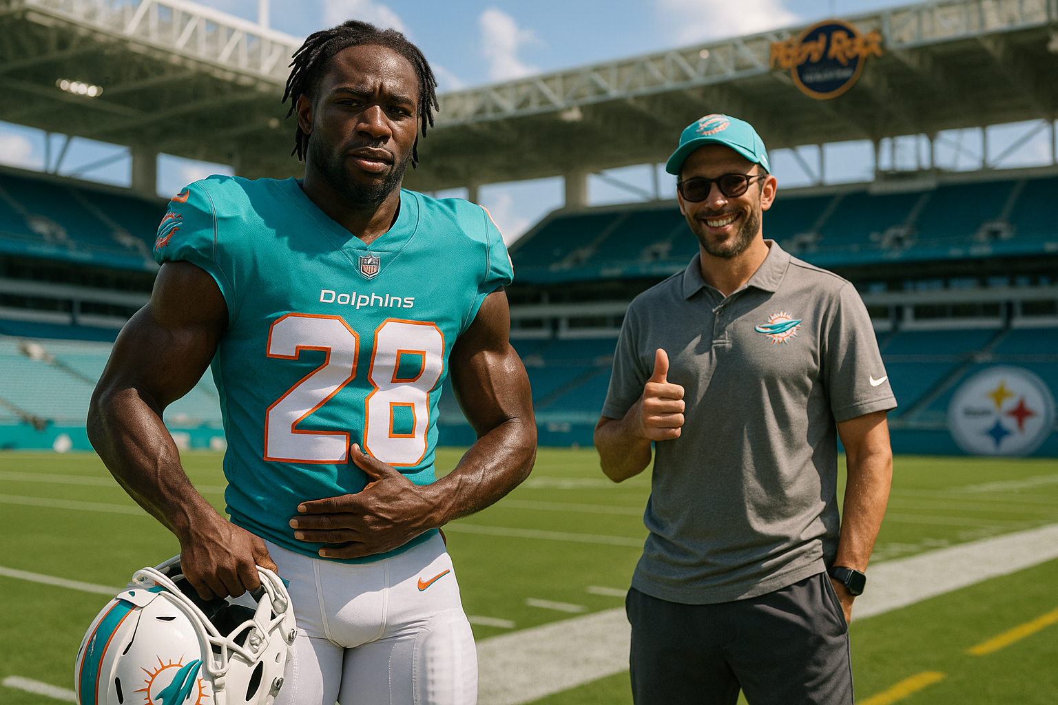Dynamic illustration of Steelers-Dolphins NFL matchup, showing Dolphins' surge past injured Steelers defense and new roster addition amid win streak.