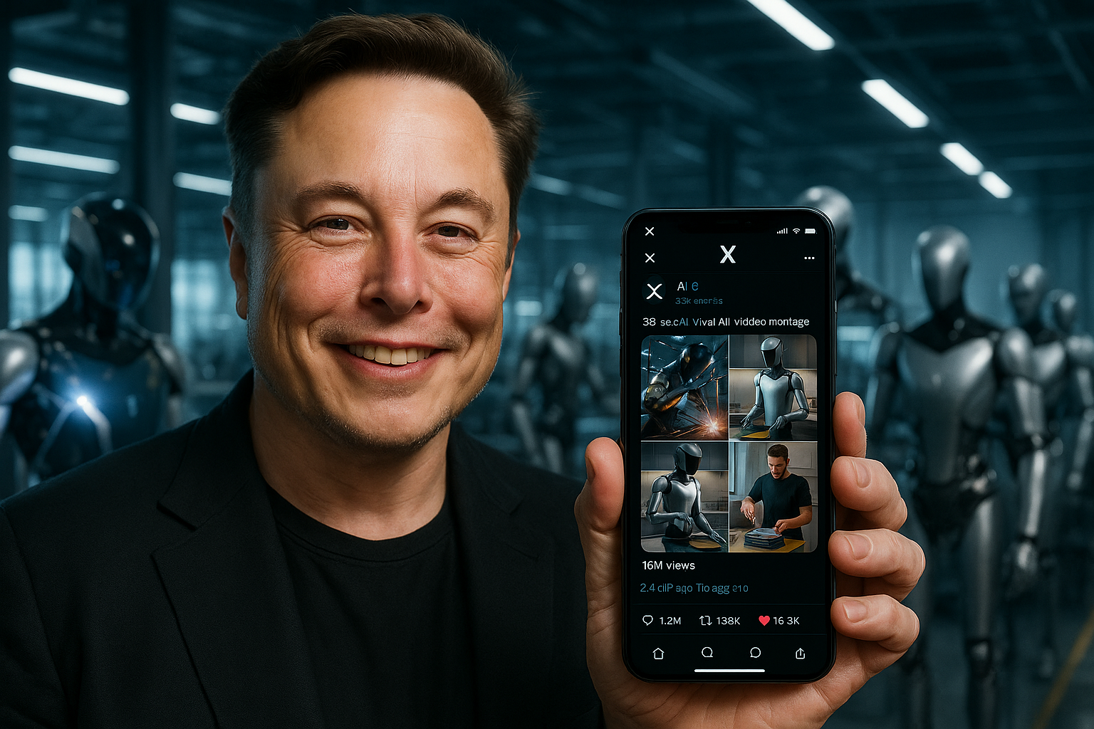 Photorealistic illustration of Elon Musk sharing a viral AI video on X featuring Tesla Optimus robots performing construction, cooking, and other human tasks.