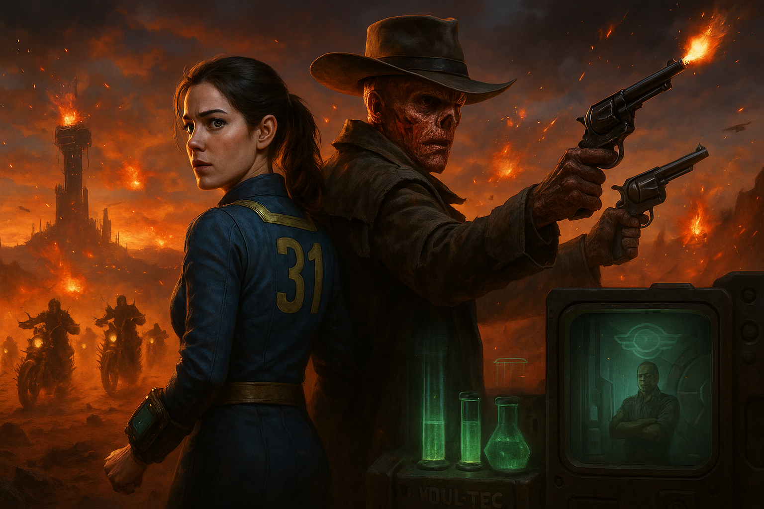 Photorealistic scene from Fallout Season 2 premiere: Lucy and The Ghoul face Khan raiders in a wasteland showdown toward New Vegas, with Vault-Tec intrigue.