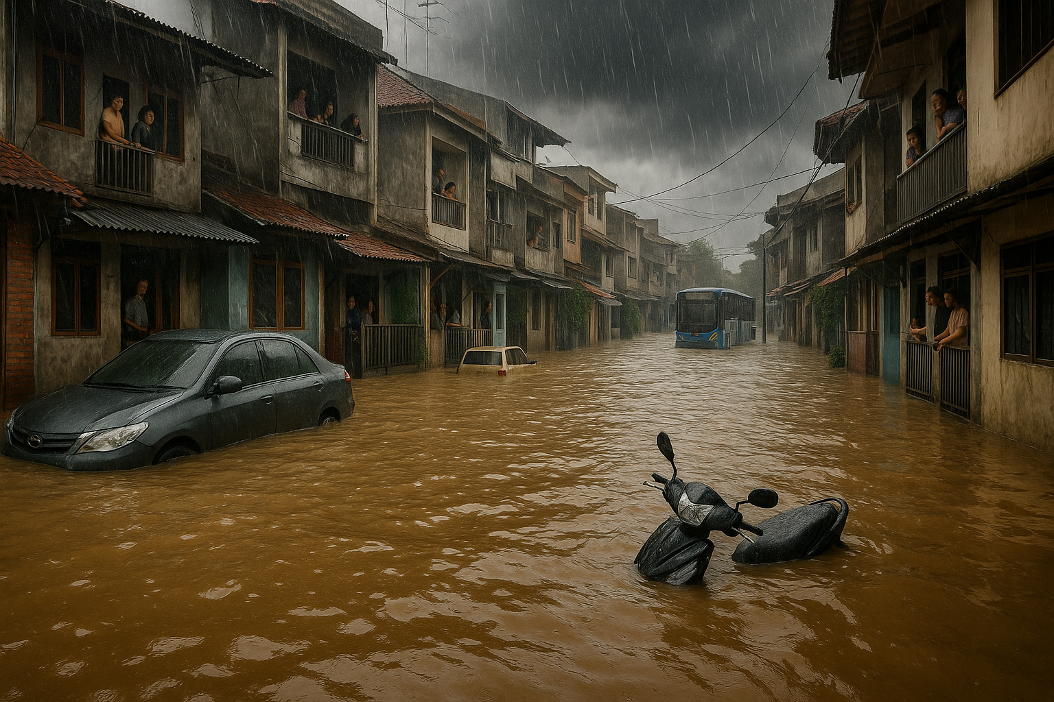 Flooded streets in Eastern Jakarta with 150 cm water levels, residents on upper floors of homes, and diverted Transjakarta bus amid heavy rain.