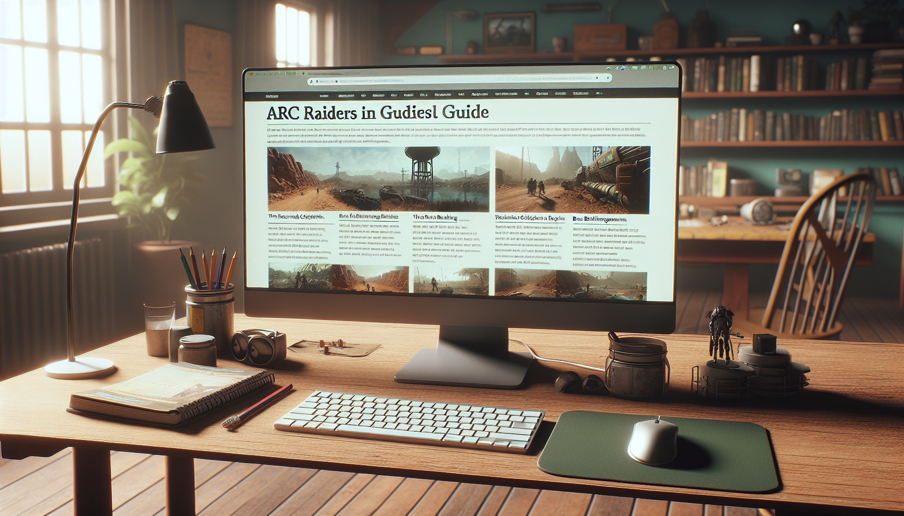 Illustration of a computer screen showing GameSpot's quest guides for Arc Raiders, featuring post-apocalyptic game elements and strategies.