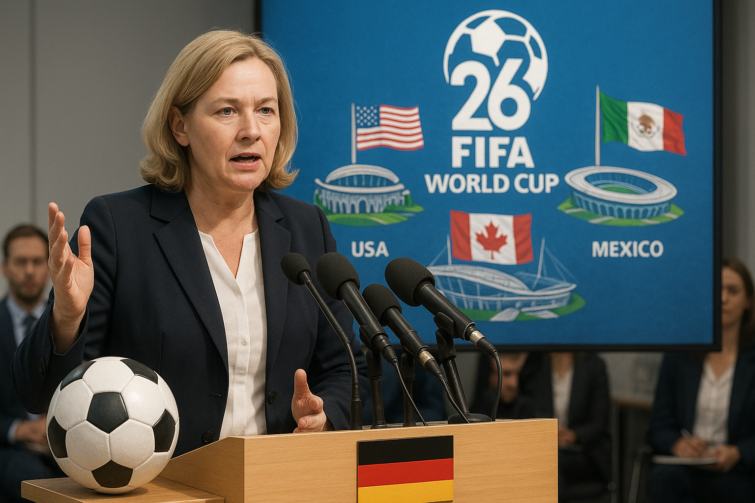 German minister Christiane Schenderlein at press conference rejecting boycott of 2026 World Cup hosted by USA, Canada, Mexico.