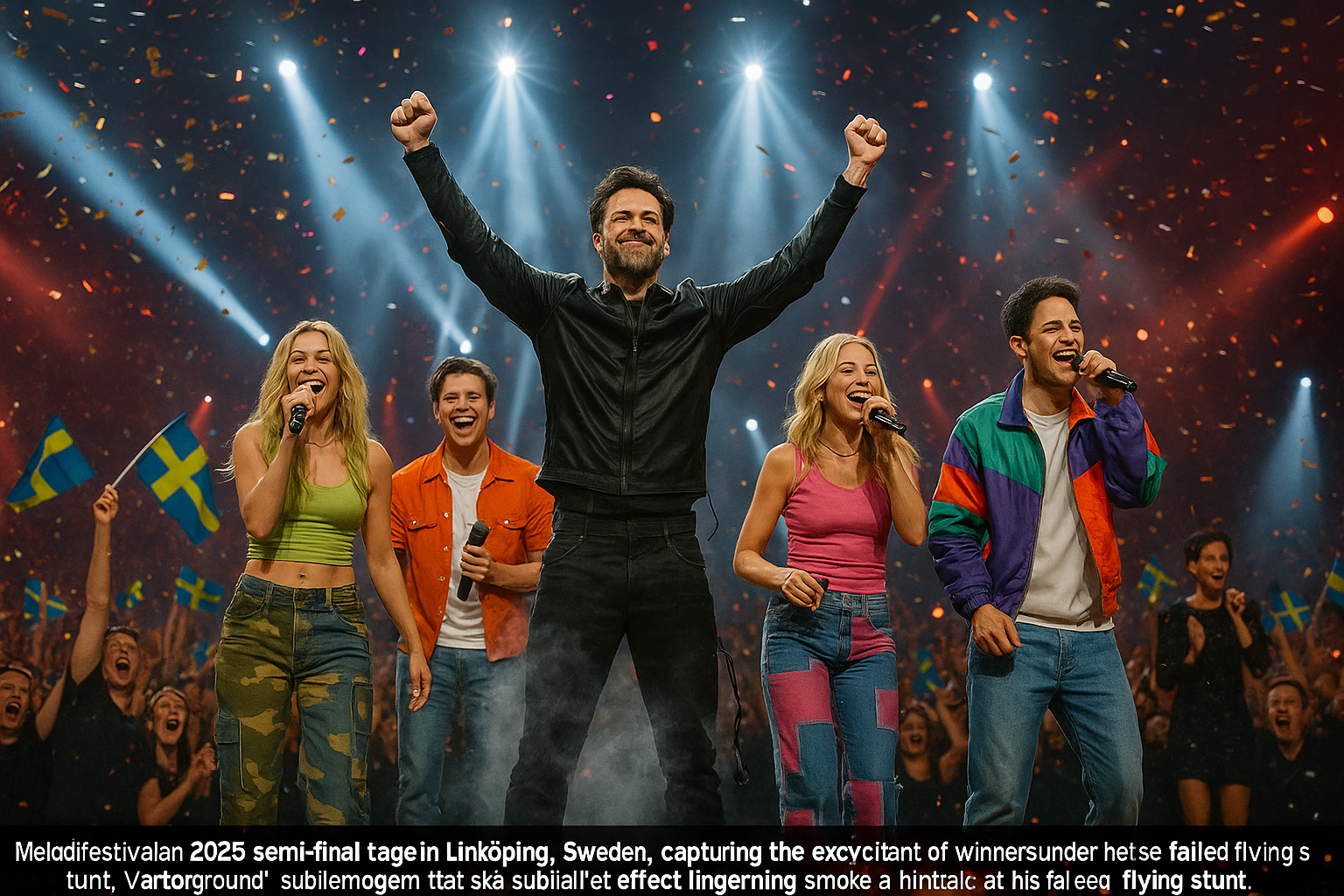 Illustration of Greczula and A-Teens celebrating their advancement to the Melodifestivalen 2026 final on the Linköping semi-final stage amid cheers and lights.