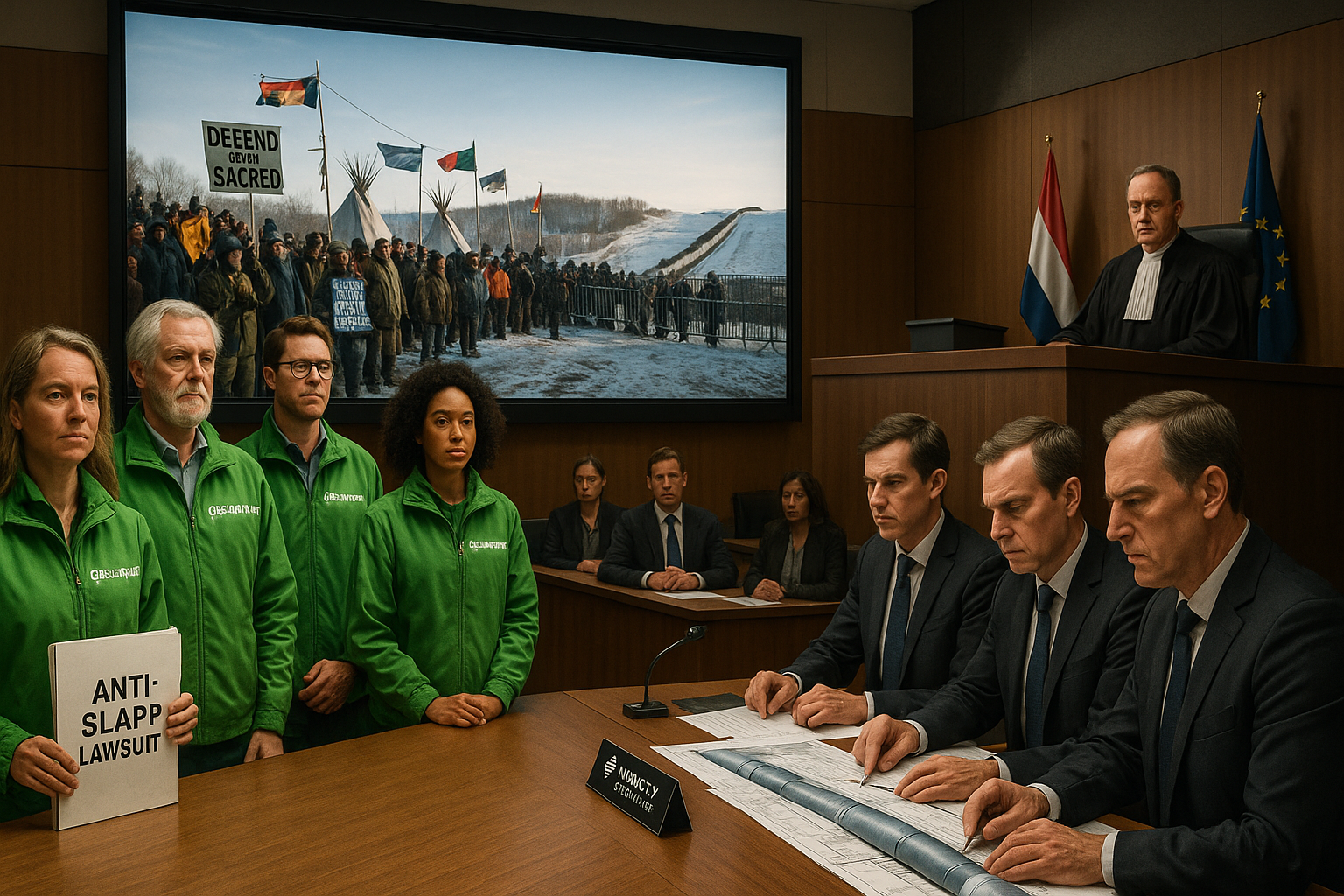 Dutch courtroom scene of Greenpeace's anti-SLAPP lawsuit against Energy Transfer, with Dakota Access Pipeline protest imagery on display.