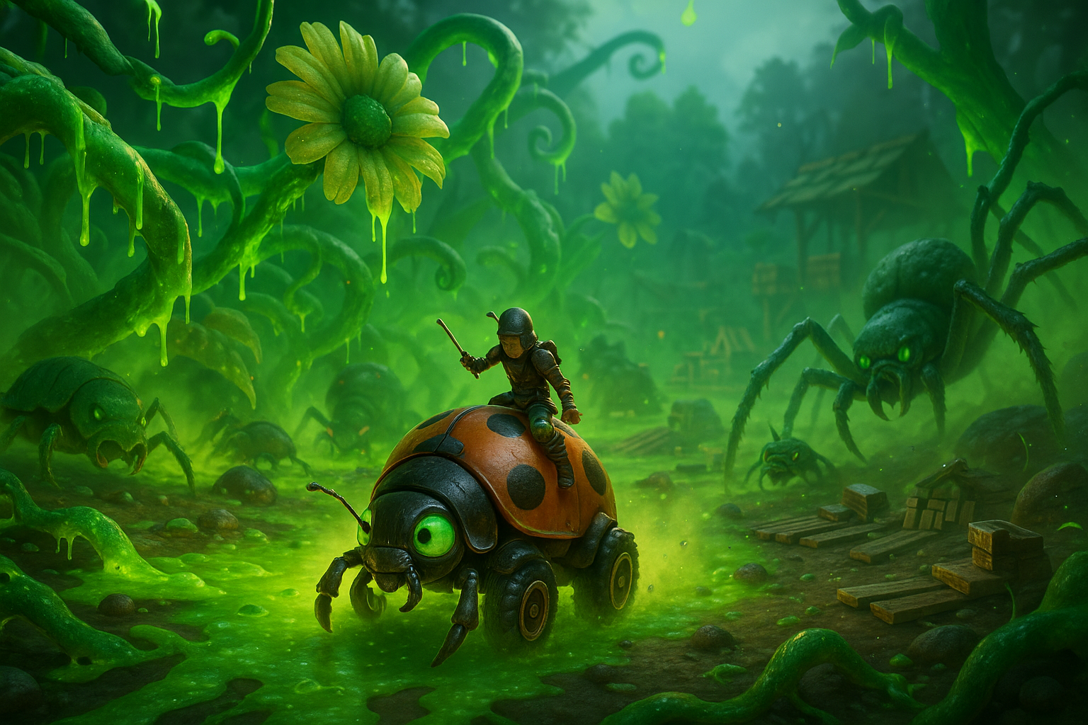 Photorealistic illustration of Grounded 2's Toxic Tangle update, showing a player on a Ladybug mount exploring the corrupted Garden biome amid toxic plants and enemies.