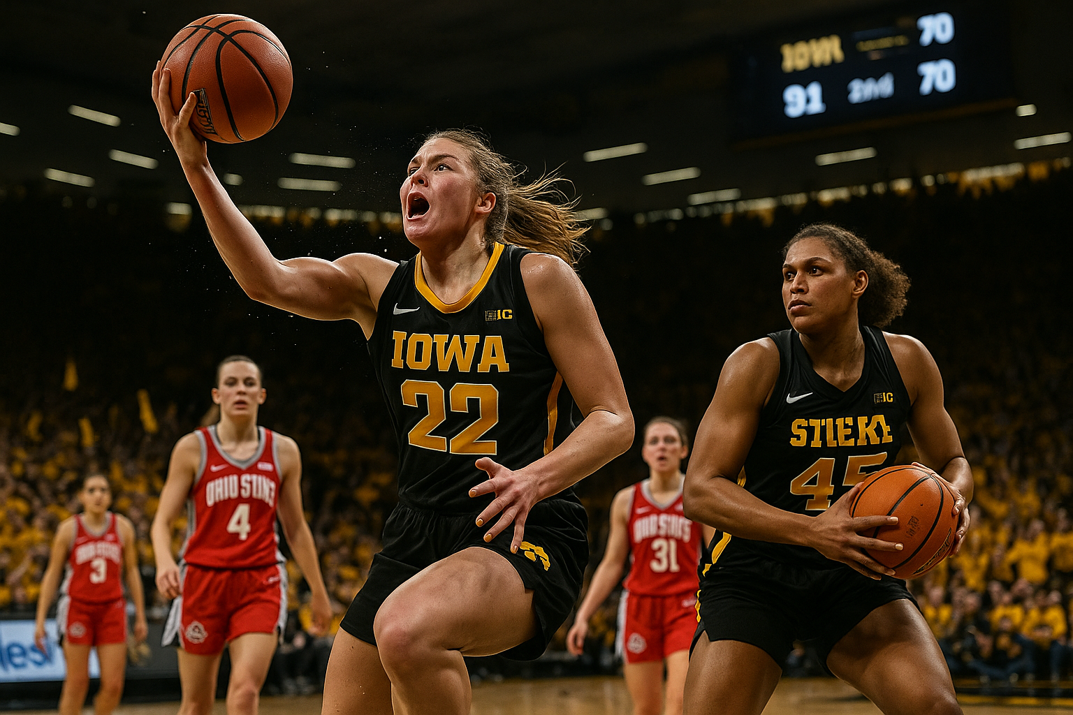 Le No. 10 Iowa Hawkeyes (18-2, 9-0 Big Ten) hanno ospitato le No. 12 Ohio State Buckeyes (18-3, 7-2 Big Ten) in un match cruciale di conference alla Carver-Hawkeye Arena. Iowa è partita forte dopo un avvio 8-2 di Ohio State. Una risposta 12-0 delle Hawkeyes, trainata da 8 punti di Addie Deal nel primo quarto, ha portato Iowa sul 24-14 dopo il primo periodo. Nel secondo quarto, Kylie Feuerbach ha aperto con due triple consecutive, contribuendo ai 24 punti di Iowa, inclusi cinque da oltre l'arco. La difesa delle Hawkeyes ha limitato Ohio State al 25% da tre, assicurando un vantaggio all'intervallo di 48-32 con 17 rimbalzi. Iowa ha continuato a dominare dopo l'intervallo, segnando i primi 12 punti in area e tirando al 58,8% dal campo nel terzo. Stuelke ha aggiunto quattro rimbalzi per il doppio-doppio, mentre Iowa ha esteso il vantaggio a 71-51 entrando nell'ultimo quarto. Entrambe le squadre hanno stretto in difesa nel finale, ma Ava Heiden è stata perfetta 4/4 in area e Chit-Chat Wright ha segnato otto punti nel quarto per 14 totali. Le Hawkeyes hanno chiuso la vittoria 91-70, segnando l'ottava vittoria consecutiva e un inizio 9-0 in Big Ten, pareggiando il miglior risultato dal 1995-96. Prestazioni chiave: 20 punti, cinque assist e tre rimbalzi di Deal – il suo miglior match contro Big Ten da Caitlin Clark nel 2021. Stuelke 18 punti e 14 rimbalzi, Heiden 18 punti, otto rimbalzi e quattro rubate, Wright 14 punti con cinque rimbalzi e quattro assist. Feuerbach otto punti e massimo in carriera di otto assist. La partita è iniziata male per Iowa quando la senior guardia Taylor McCabe ha subito un infortunio non da contatto al ginocchio sinistro nella prima azione difensiva su Ava Watson di Ohio State. McCabe, media di 8,5 punti a partita, non è tornata e vista con il ginocchio fasciato. Coach Jan Jensen post-partita: «Tante preghiere per McCabe. Non sappiamo ancora cos'è, ma quella ragazza ha dato tanto e ha guidato splendidamente.» Questa vittoria è la prima nella storia del programma in cui Iowa batte tre squadre AP Top 25 in tre partite consecutive di regular season. Iowa sale a 5-2 contro ranked quest'anno e 21-1 quando segna 80+ sotto Jensen.