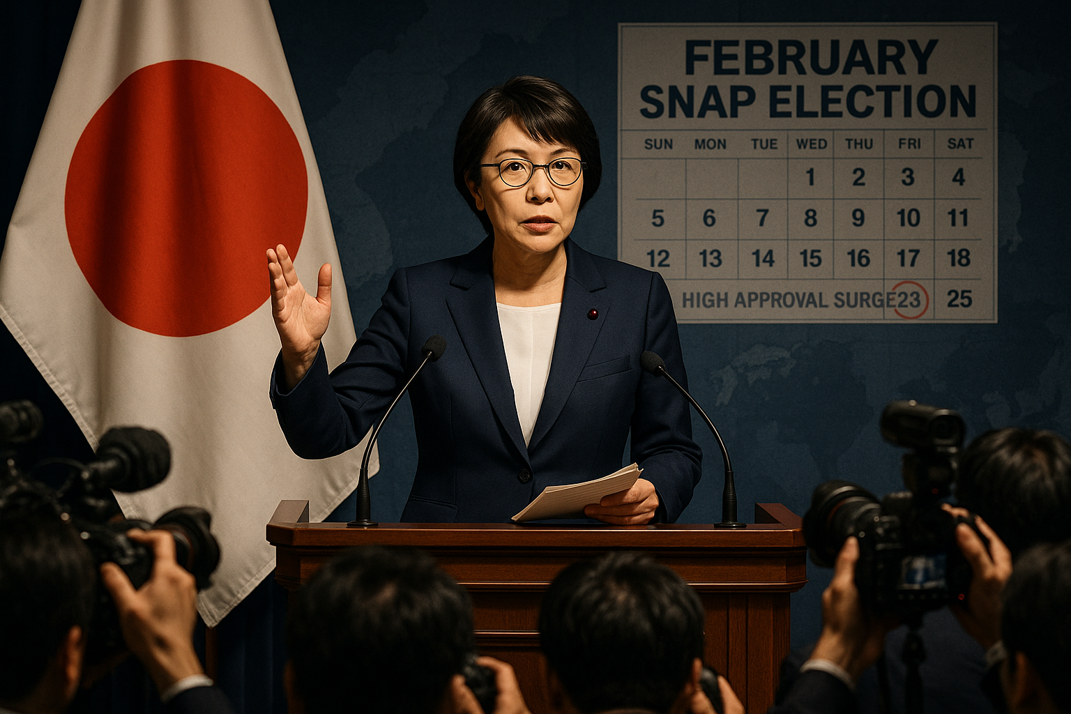 Japanese PM Sanae Takaichi announces potential snap election at press conference, with flags and journalists in realistic news illustration.