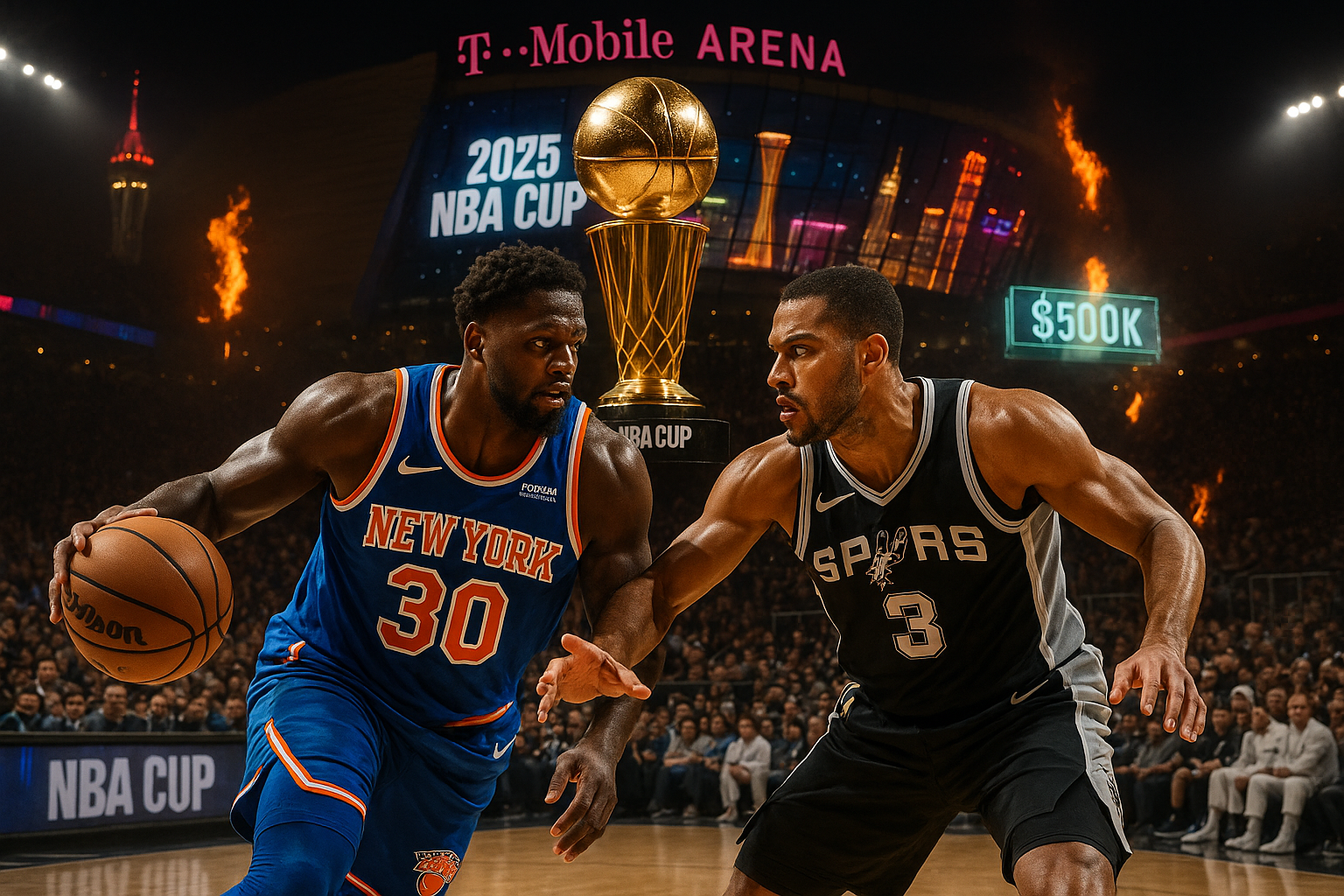 Realistic illustration of Knicks vs. Spurs NBA Cup final preview at T-Mobile Arena, capturing intense matchup, Las Vegas excitement, trophy, and high-stakes prizes.
