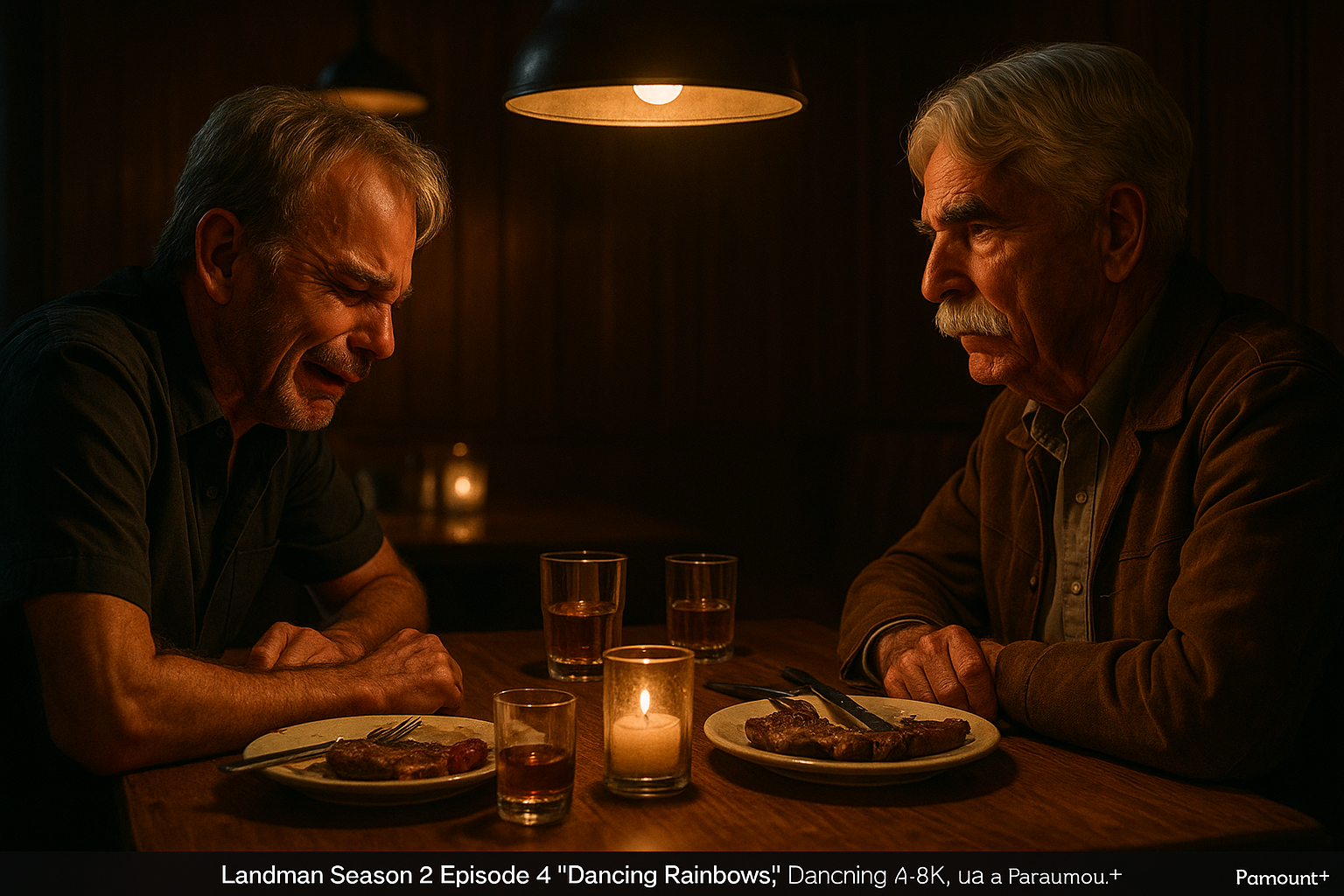 Dramatic restaurant confrontation between Billy Bob Thornton and Sam Elliott portraying a father and son grappling with family trauma in Landman Season 2 Episode 4.