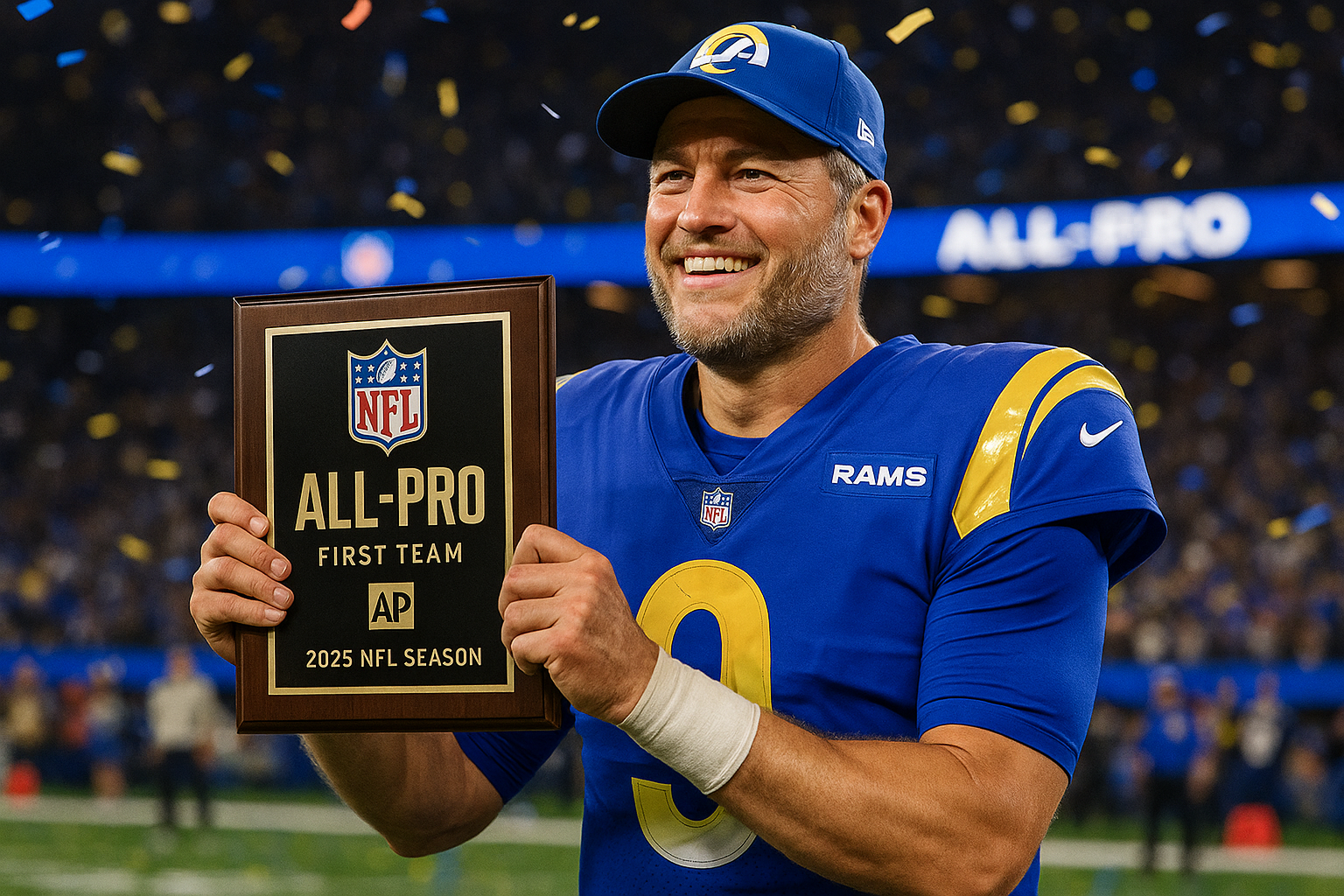 Los Angeles Rams quarterback Matthew Stafford has been selected to the first-team Associated Press All-Pro team for the 2025 NFL season, marking the first such honor in his career at age 37. He edged out New England Patriots rookie Drake Maye by 13 first-place votes from a panel of 50 media members. The selections highlight standout performances across offense, defense, and special teams following the regular season.