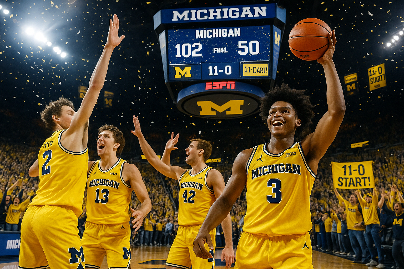 Michigan Wolverines celebrate 102-50 blowout win over La Salle at Crisler Center, improving to 11-0.