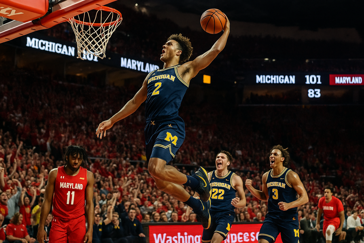 Dynamic illustration of Michigan Wolverines' 101-83 basketball victory over Maryland Terrapins, capturing second-half dominance and key moments at Xfinity Center.