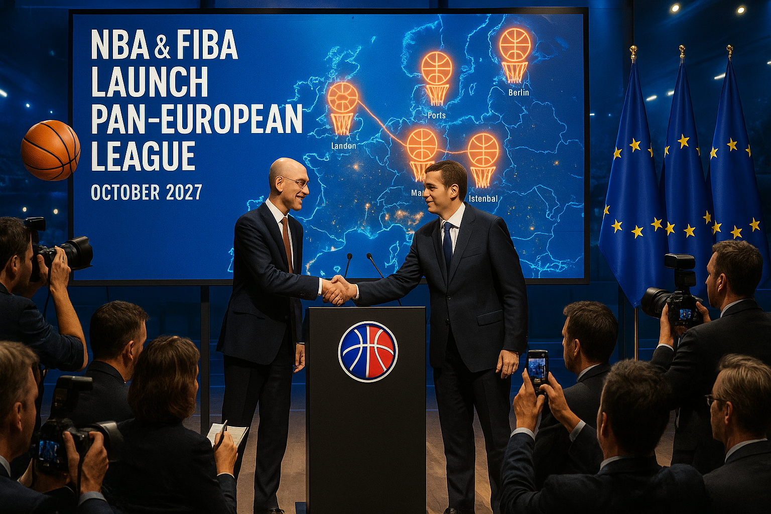 News illustration of NBA and FIBA officials announcing a new pan-European basketball league set to launch in 2027.