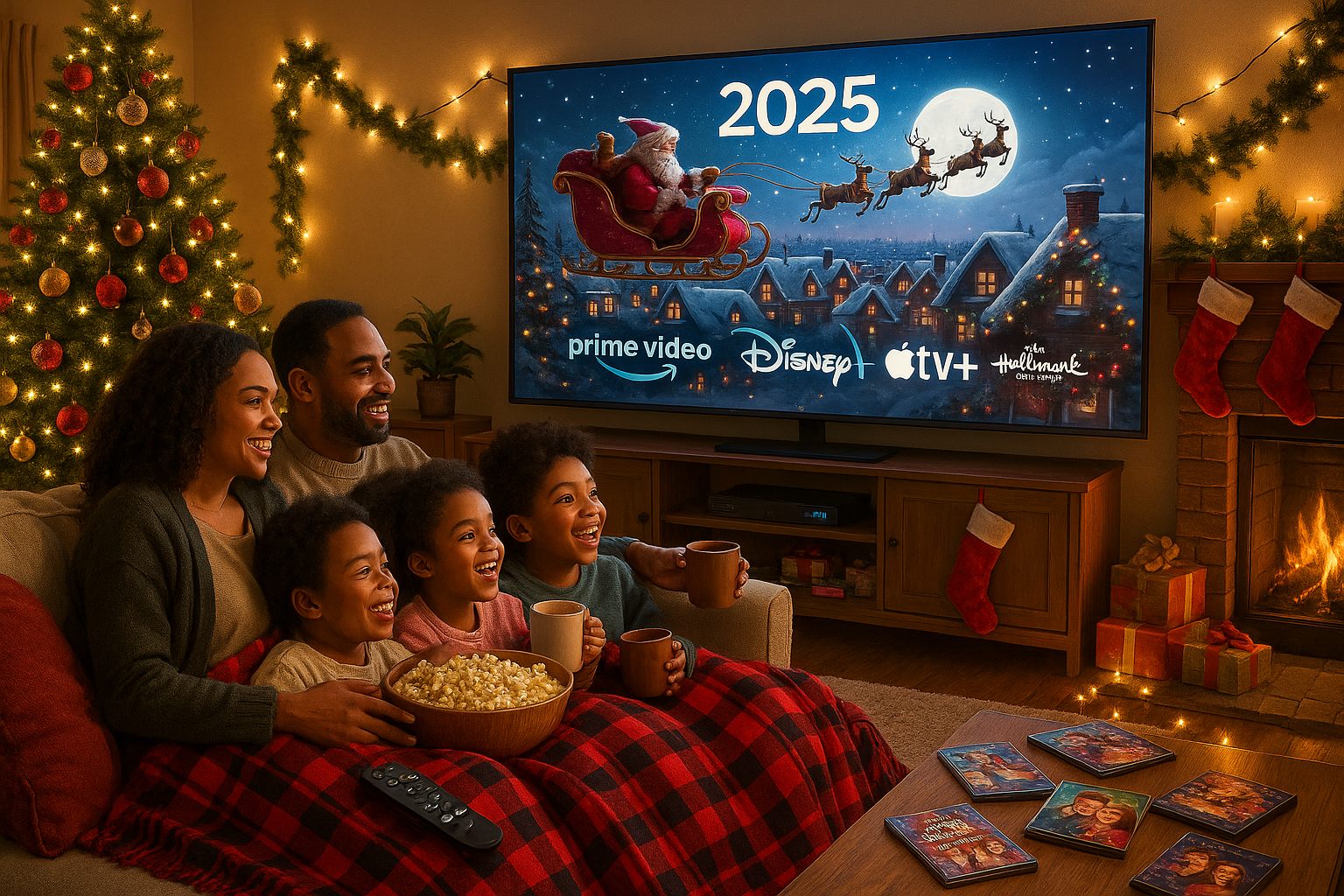 Cozy family watching new 2025 Christmas movies on streaming platforms in a festively decorated living room.