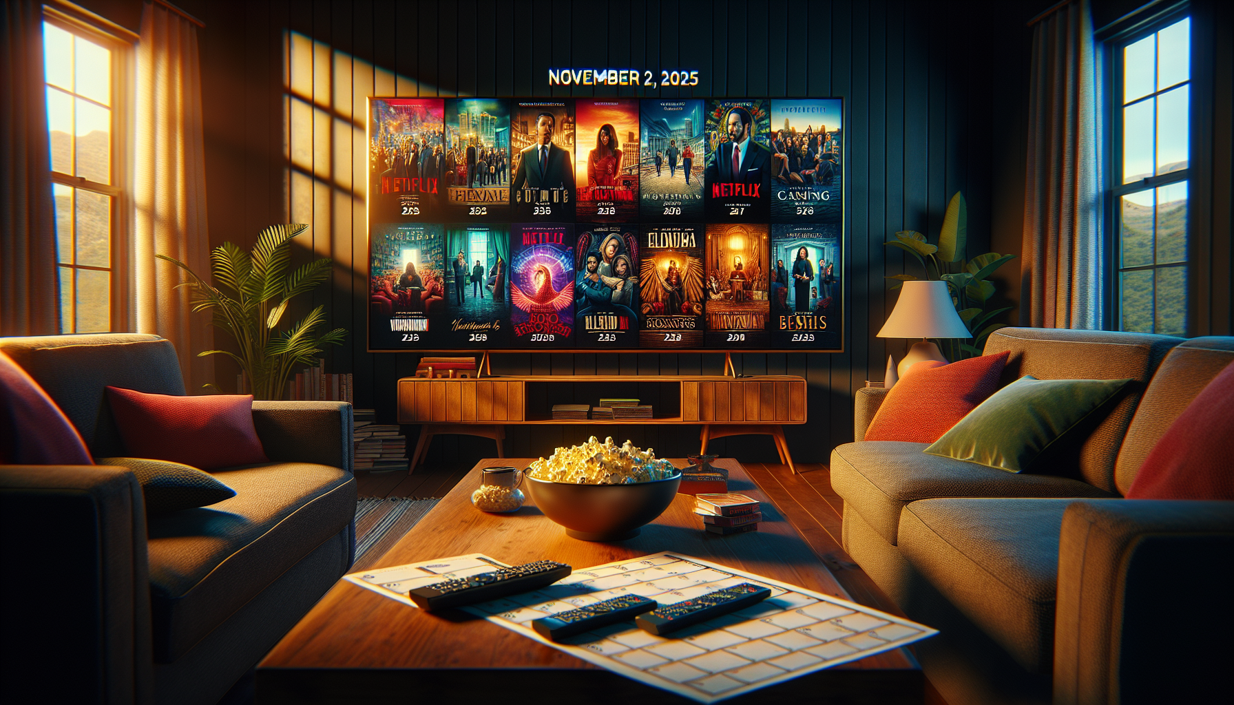 Illustration of a living room TV displaying new streaming show premieres on various platforms, highlighting November 2025 releases.