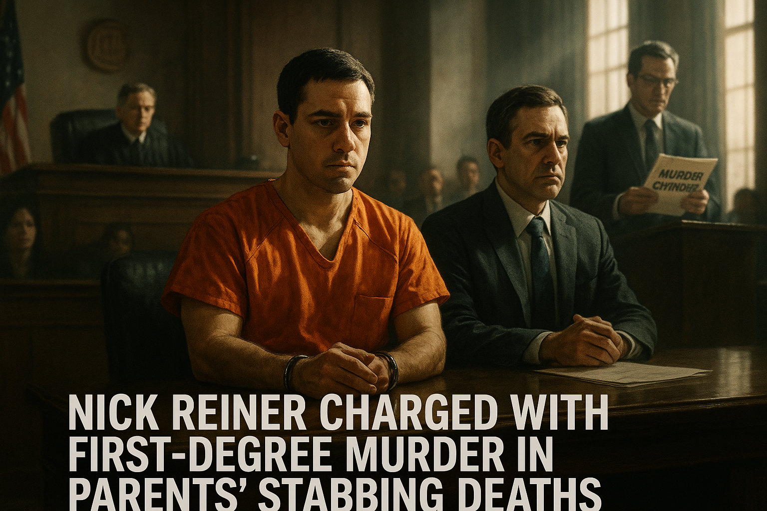 Dramatic courtroom illustration of Nick Reiner facing first-degree murder charges for his parents' deaths.