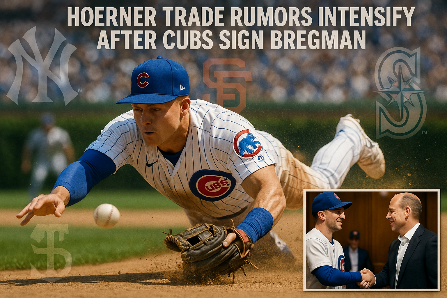 Dynamic photorealistic image of Cubs' Nico Hoerner making a diving play at second base, overlaid with logos of trade-interested teams Yankees, Giants, and Mariners, amid Bregman signing news.