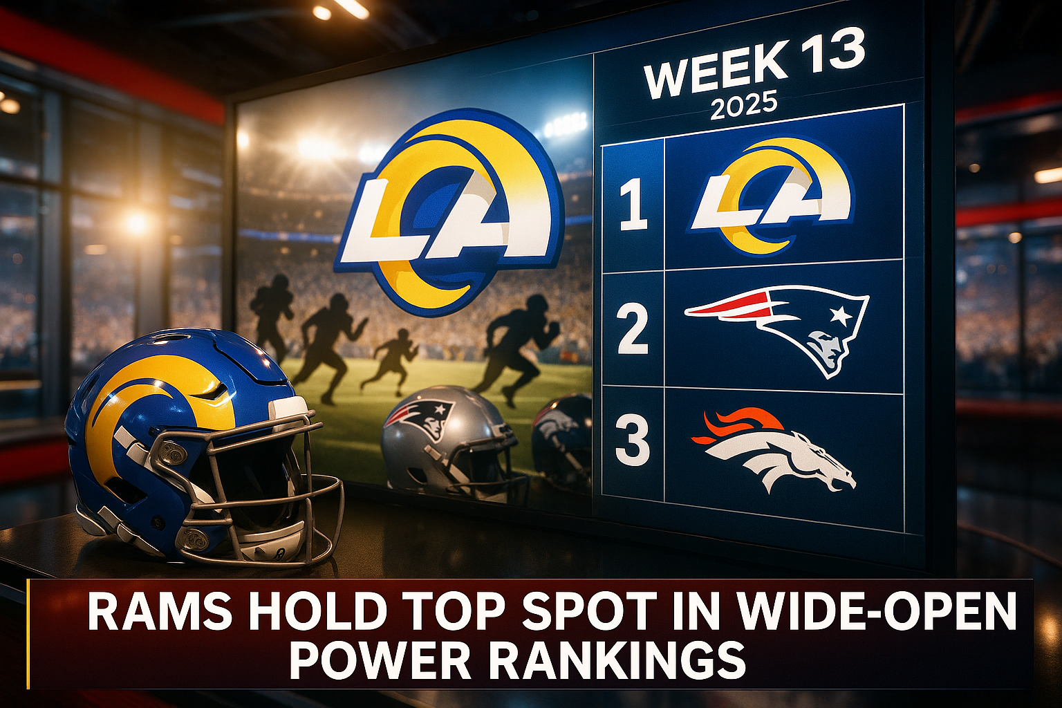 Dynamic illustration of NFL Week 13 power rankings with Rams leading a competitive field including Patriots and Broncos.