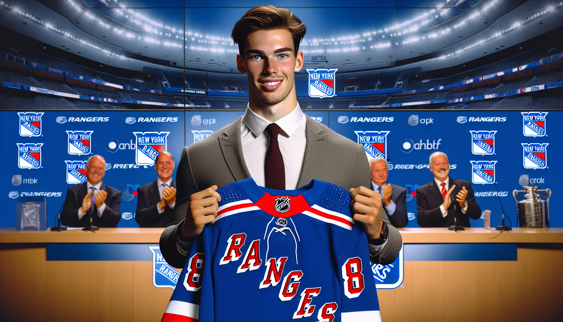 Goaltender Spencer Martin posing with a New York Rangers jersey after signing a two-year contract, surrounded by team officials at a press conference.