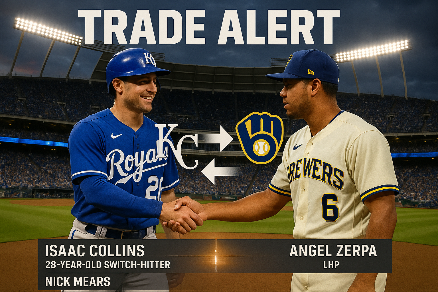 The Kansas City Royals acquired outfielder Isaac Collins and right-handed reliever Nick Mears from the Milwaukee Brewers in exchange for left-handed reliever Angel Zerpa, sources reported Saturday night. The deal, which remains unconfirmed by the teams, comes amid the Royals' active offseason pursuit of outfield help. Collins, a 28-year-old switch-hitter, had a breakout 2025 season with the Brewers.