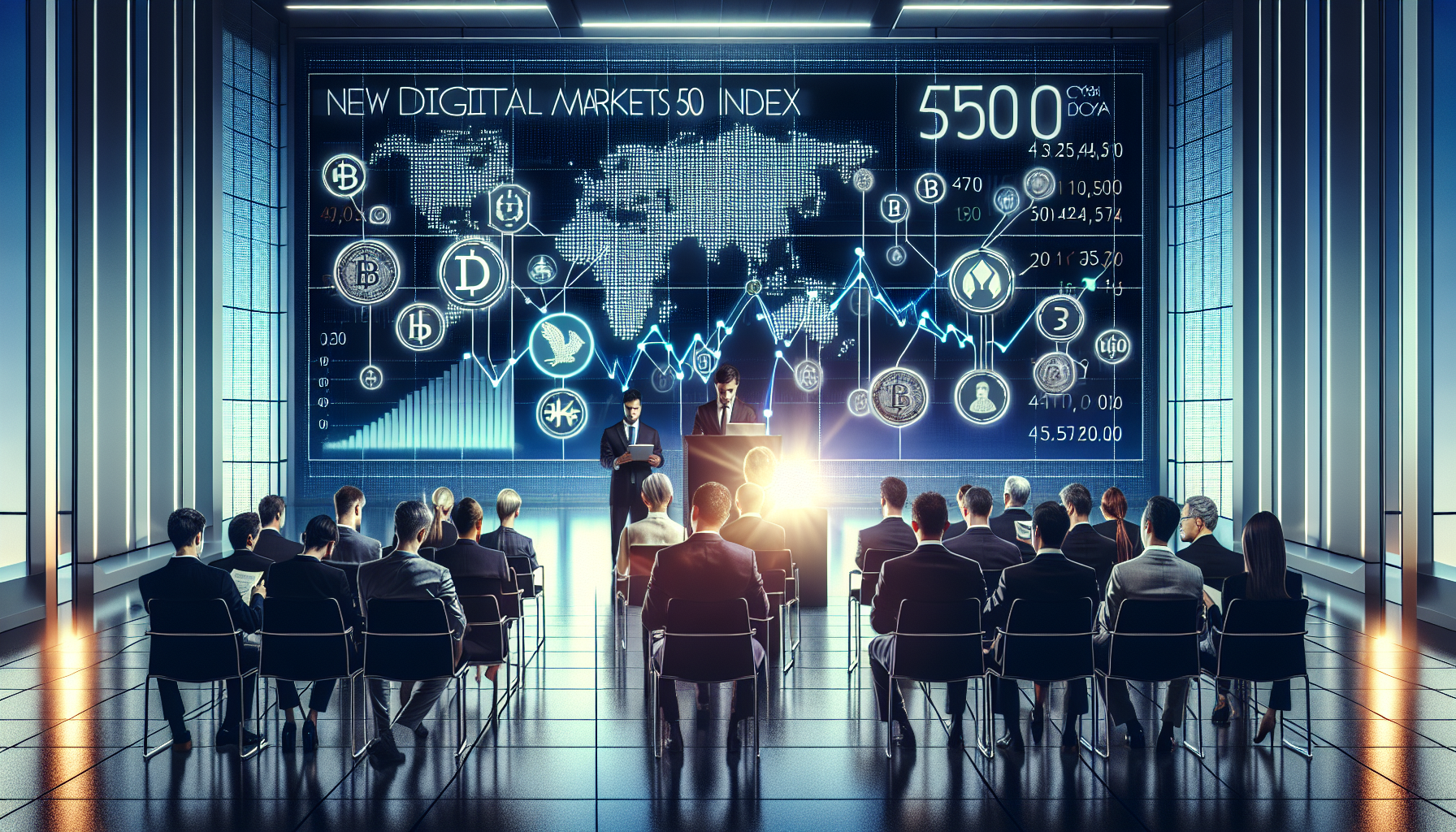 Executives announcing the S&P Digital Markets 50 Index, a hybrid crypto and equities benchmark, with a digital display showing blended financial graphs.