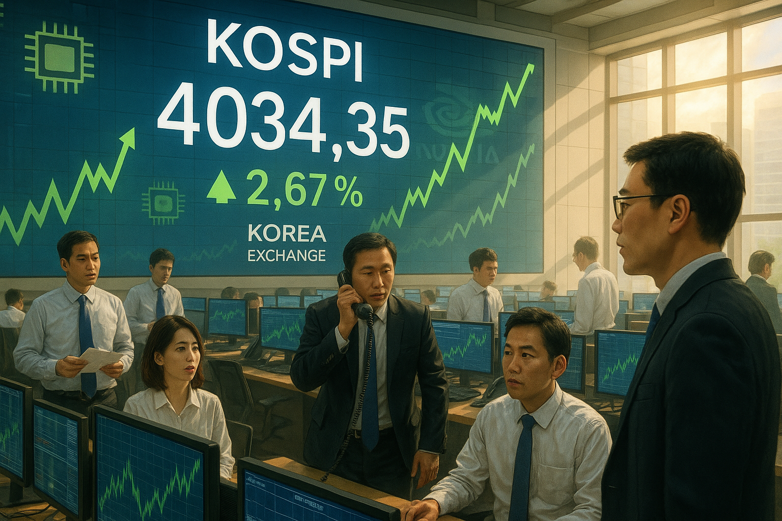 Illustration of traders on the Seoul stock exchange floor celebrating a market surge driven by semiconductor stocks following Nvidia's strong earnings, with rising KOSPI index displayed.