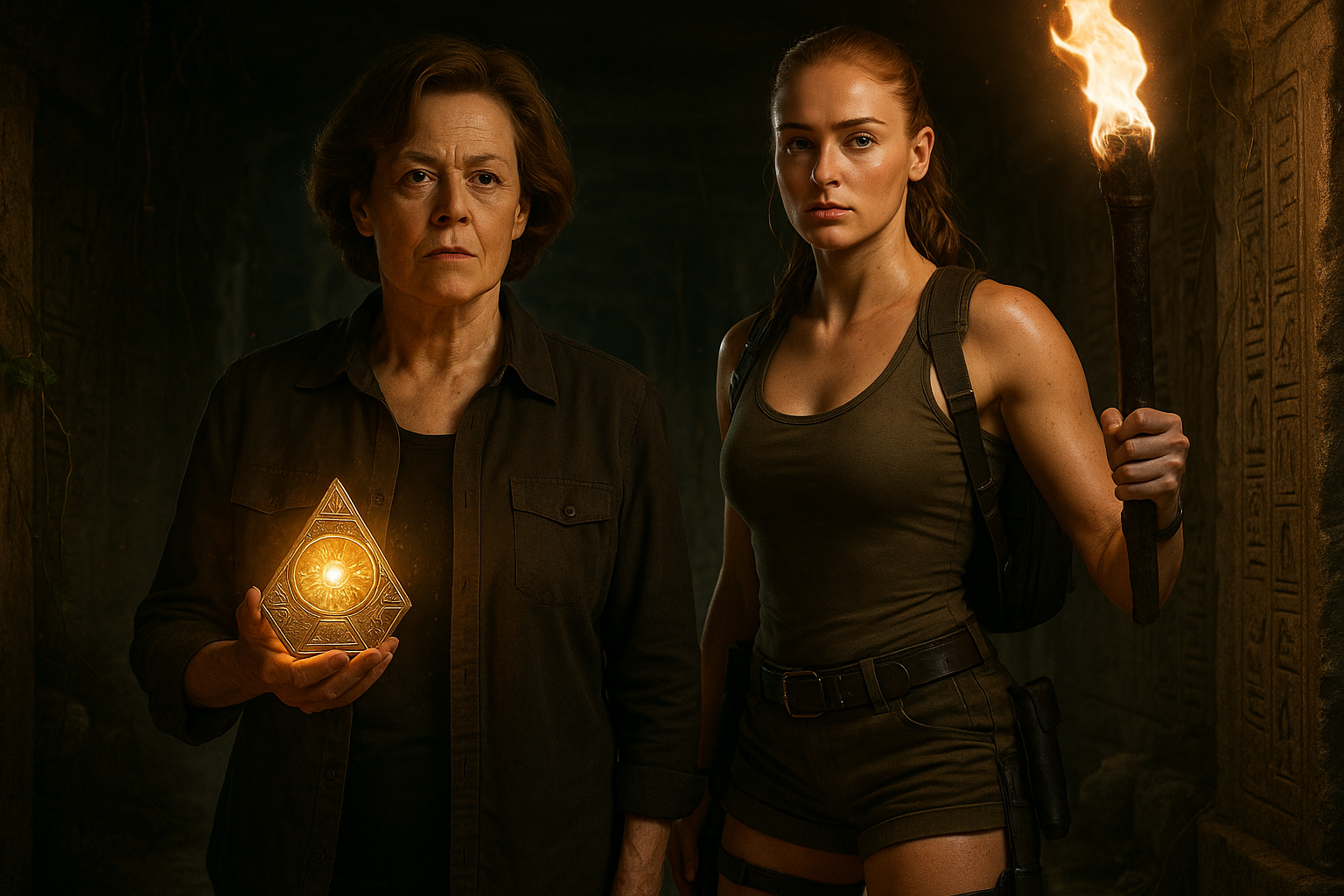 Photorealistic illustration of Sigourney Weaver joining Sophie Turner as Lara Croft in Amazon's Tomb Raider TV series, set in an ancient tomb.