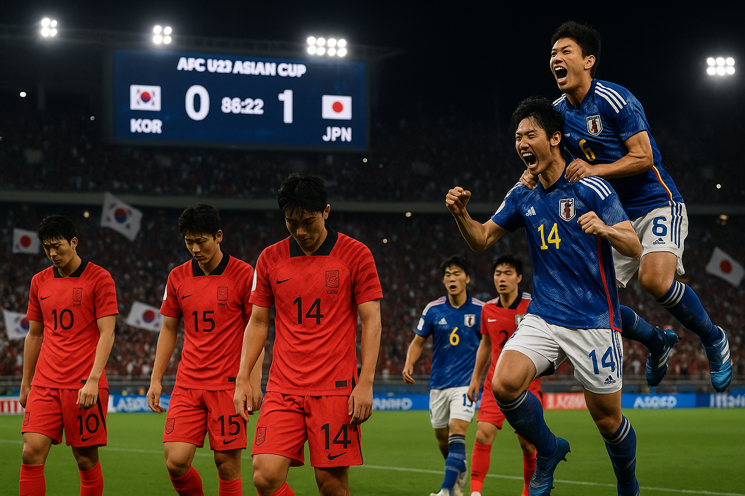 Dejected South Korean U-23 footballers after 1-0 semifinal loss to Japan in AFC Asian Cup, stadium celebration in background.