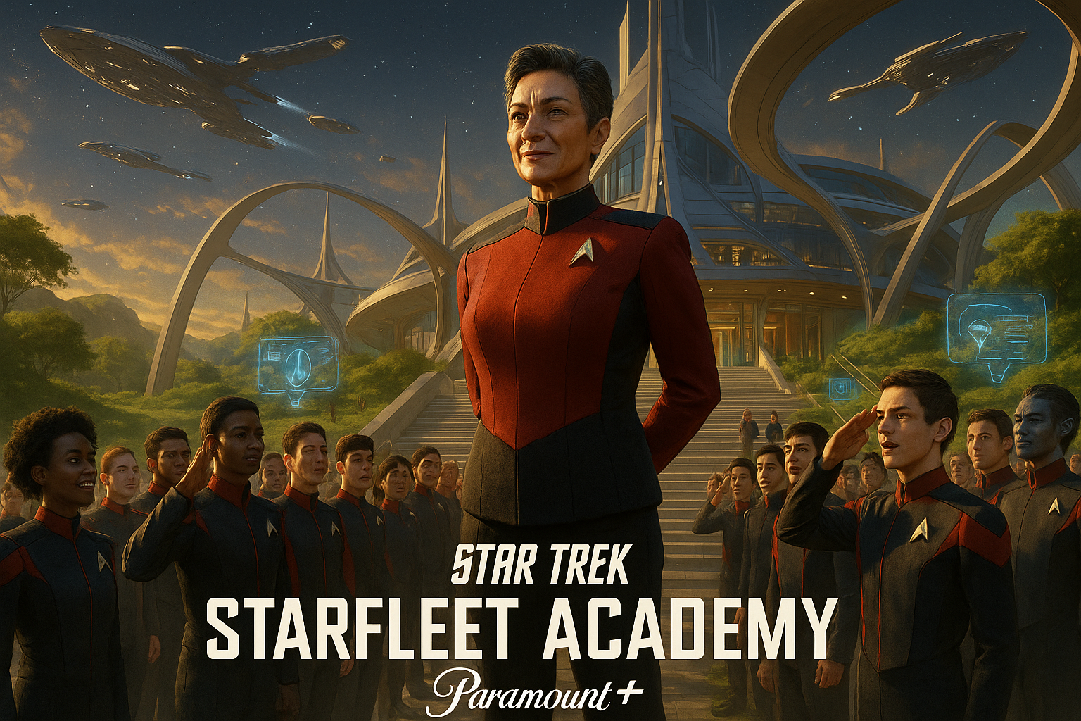 Captain Nahla Ake leads new cadets at the relaunched Starfleet Academy in this photorealistic promo image for the Paramount+ series premiere.