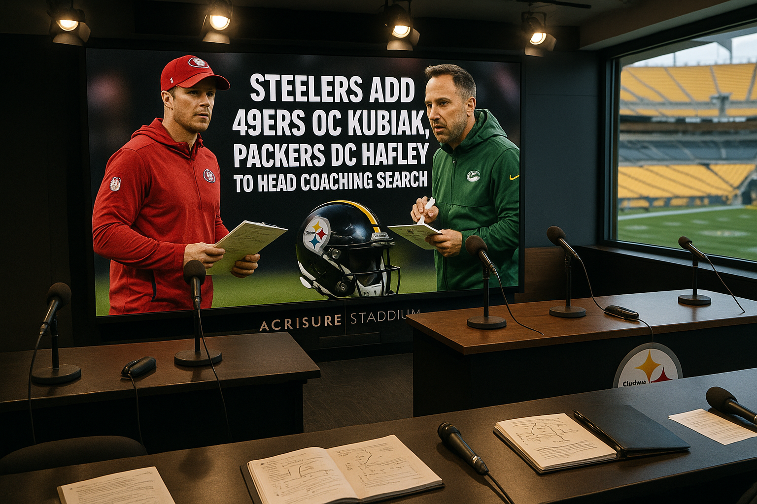 Illustrative photo of Pittsburgh Steelers' head coaching search expansion, featuring candidates Klay Kubiak and Jeff Hafley with team elements.