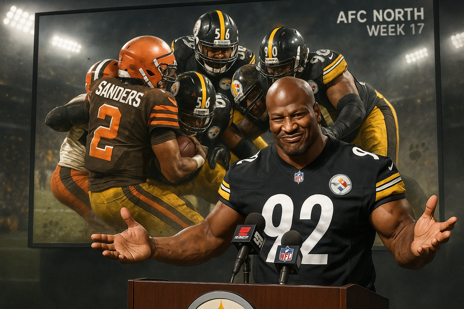 Photorealistic image of Steelers vs. Browns NFL game at Huntington Bank Field, highlighting injuries like sidelined T.J. Watt amid AFC North clinch tension.