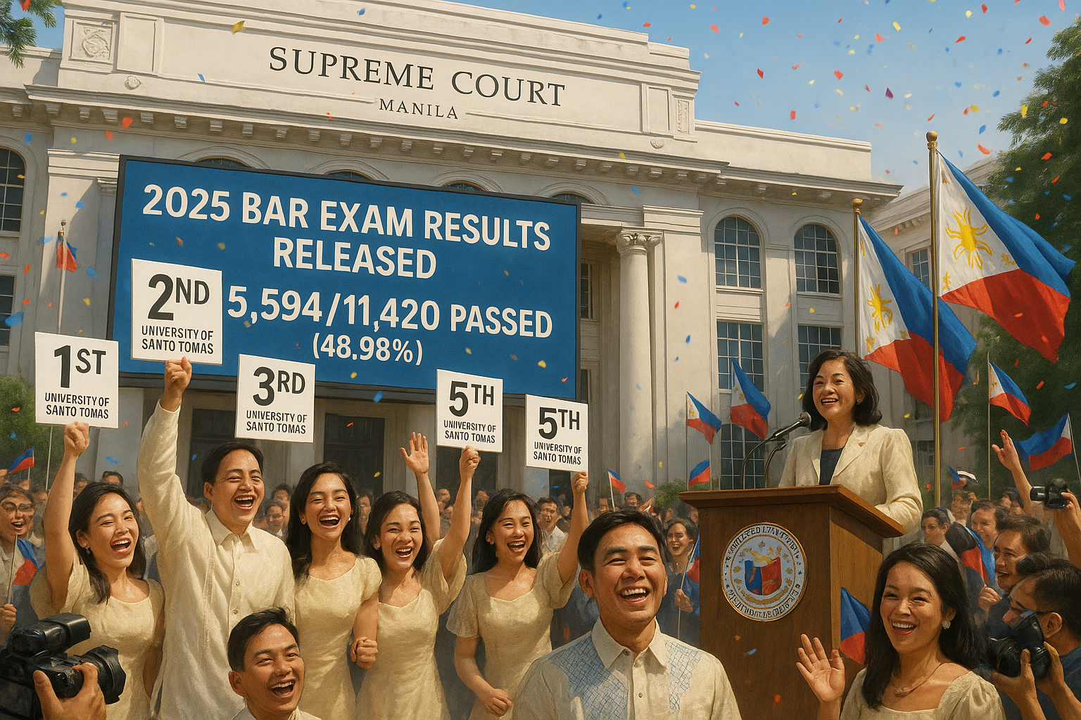 The 2025 Bar Examinations results were announced on January 7, 2026, by the Supreme Court, marking a significant milestone for aspiring lawyers in the Philippines. Out of 11,420 examinees who completed the tests held on September 7, 10, and 14, 2025, 5,594 passed, resulting in a passing rate of 48.98%. Five examinees were disqualified due to incomplete documentation, reducing the final count from an initial 11,425 completers.