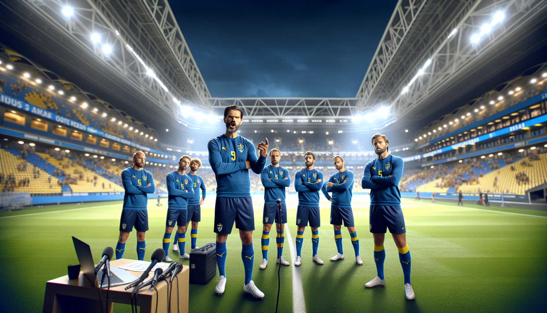 Sweden's football team and coach Jon Dahl Tomasson preparing at Ullevi Stadium for VM qualifier against Kosovo, amid team pressure and rumors.