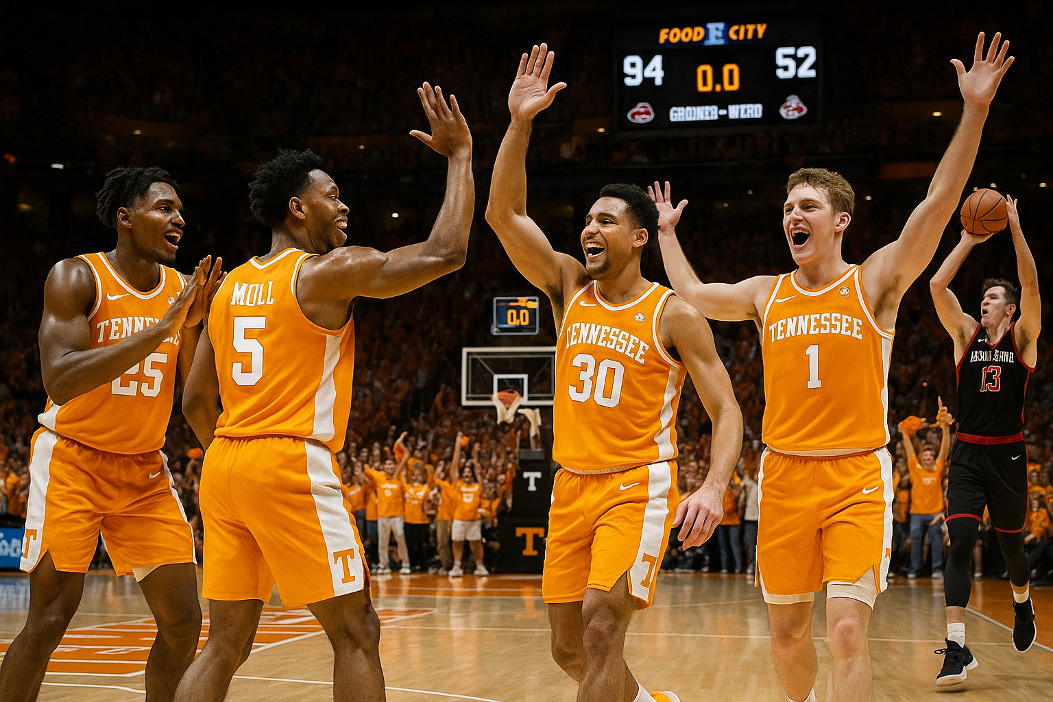 Tennessee Vols players celebrate record-tying 43rd straight non-conference home win, dominating Gardner-Webb 94-52 at Food City Center.