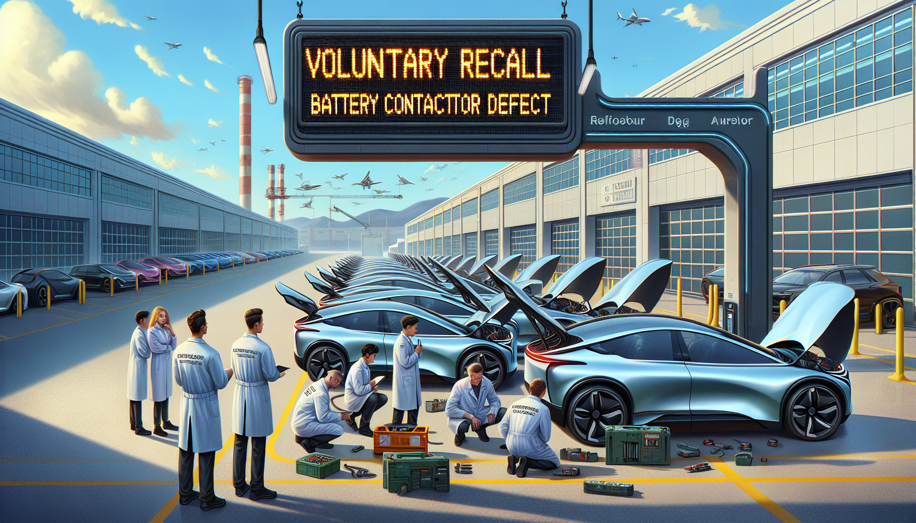 Photo illustrating Tesla's recall of 13,000 Model 3 and Y vehicles due to battery defect, showing cars at a service center with technicians and a recall notice.