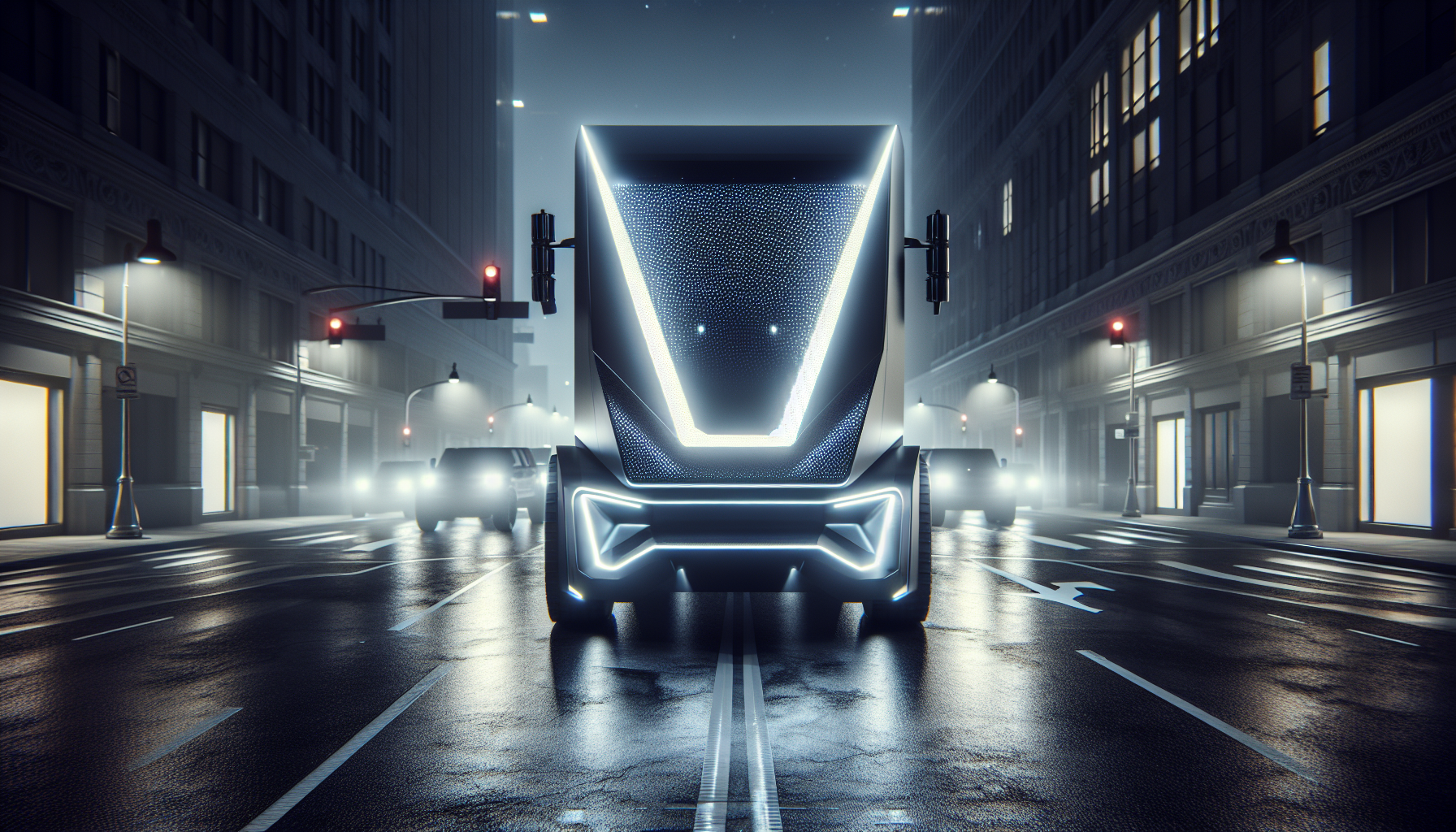 A Tesla Cybertruck with overly bright front parking lights on a dark street, illustrating the recall issue for a news article.