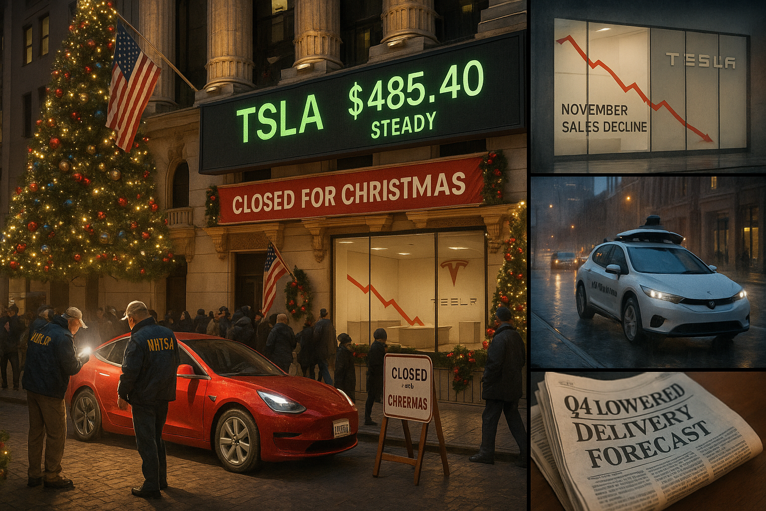 Markets closed for Christmas on December 25, 2025, left Tesla shares near the prior $485.40 close, as new details emerged on the NHTSA Model 3 door probe, November sales declines, and unsupervised robotaxi trials in Austin—offsetting lowered Q4 delivery forecasts ahead of January 2 reports.