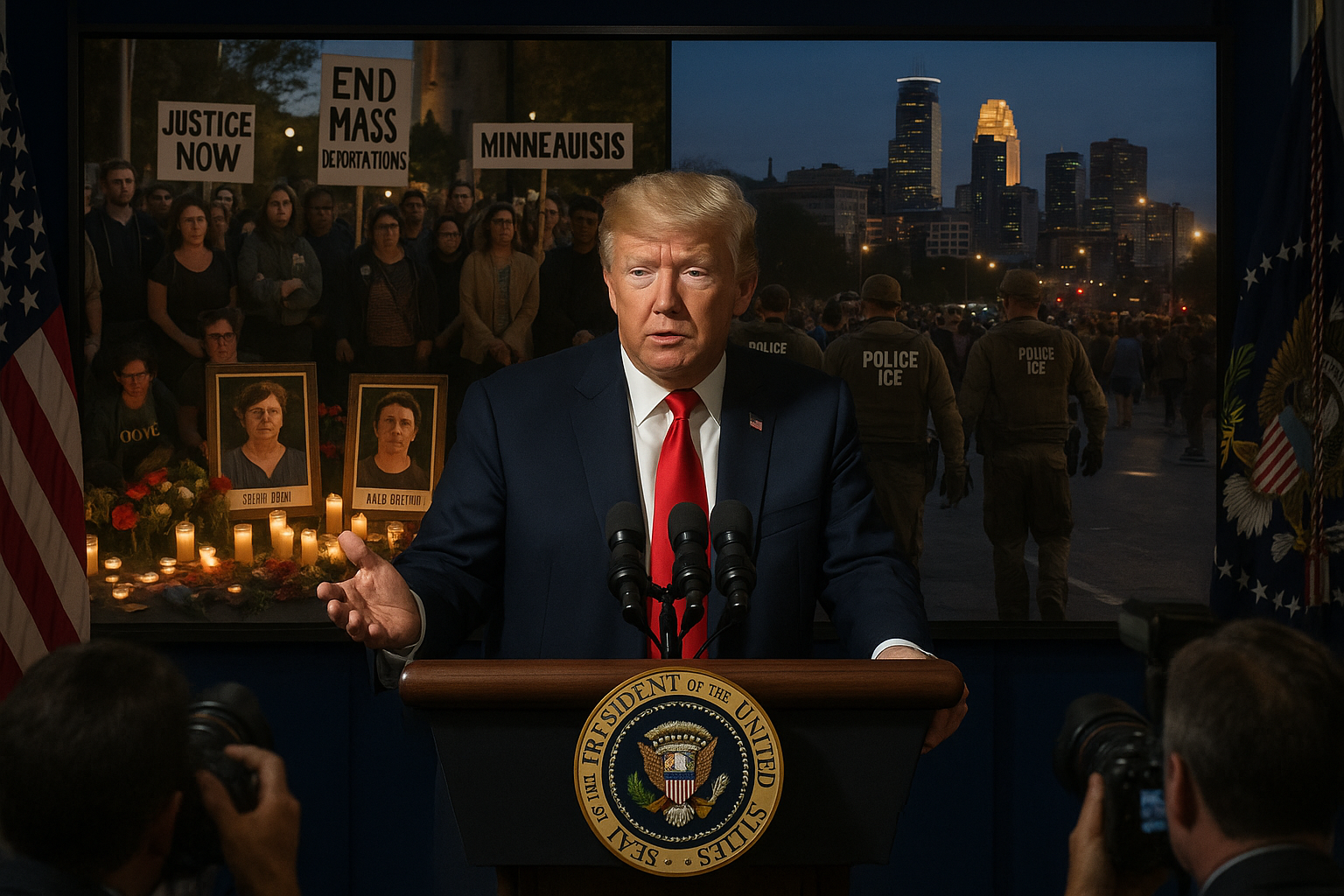 President Trump at podium announcing softer deportation policy after Minneapolis anti-ICE activist shootings, with vigil and protest visuals in background.