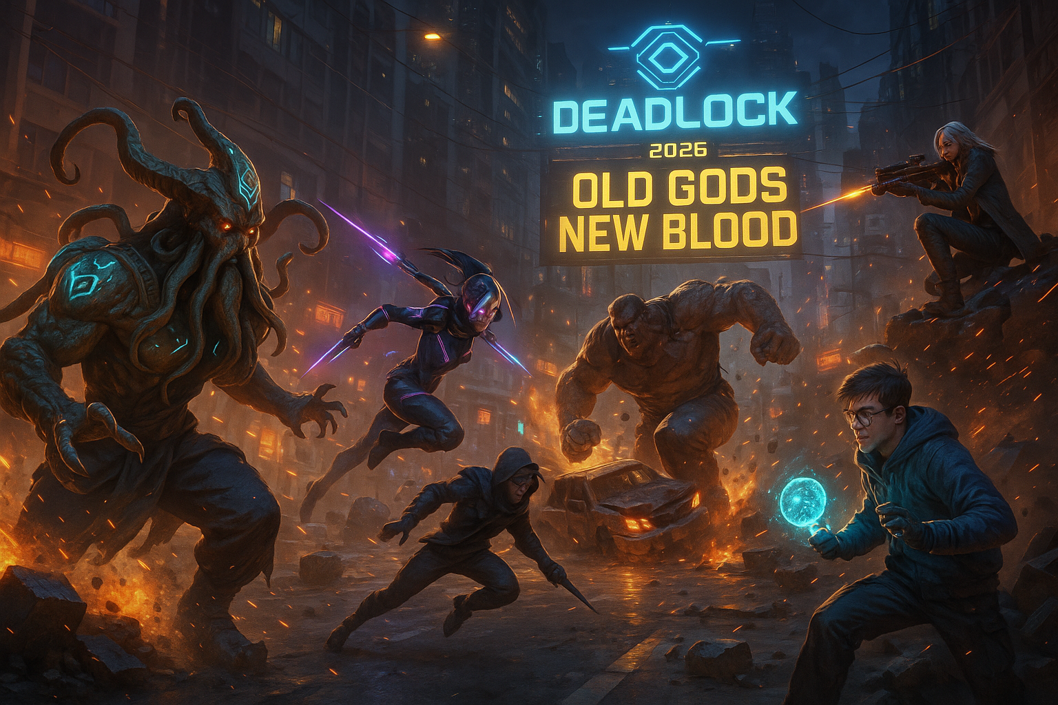 Dynamic illustration of six new Deadlock heroes battling in the Street Brawl mode from the 'Old Gods New Blood' update.